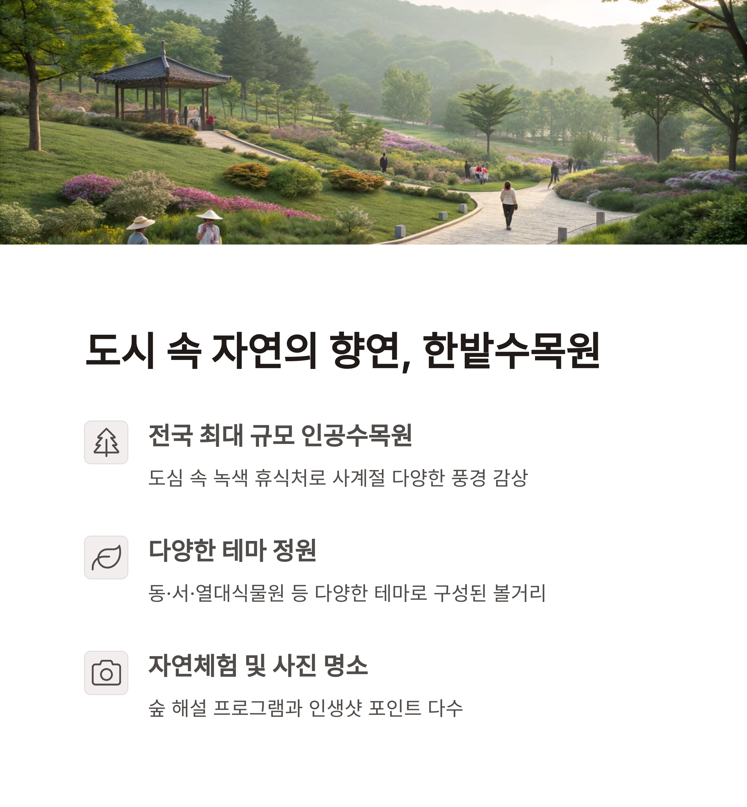 한밭수목원은 대전 중심부에 위치한 전국 최대 도심 인공수목원으로, 동원과 서원으로 나눠 다양한 식물과 풍경을 감상할 수 있습니다.