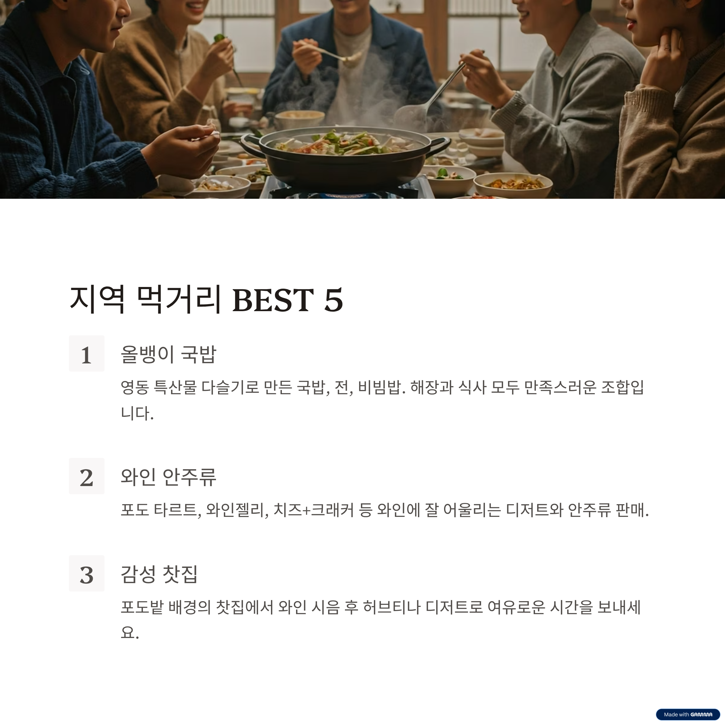 와인을 잘 몰라도 괜찮습니다. 분위기와 맛, 그리고 지역 먹거리를 즐기기만 해도 충분한 만족을 느낄 수 있어요.