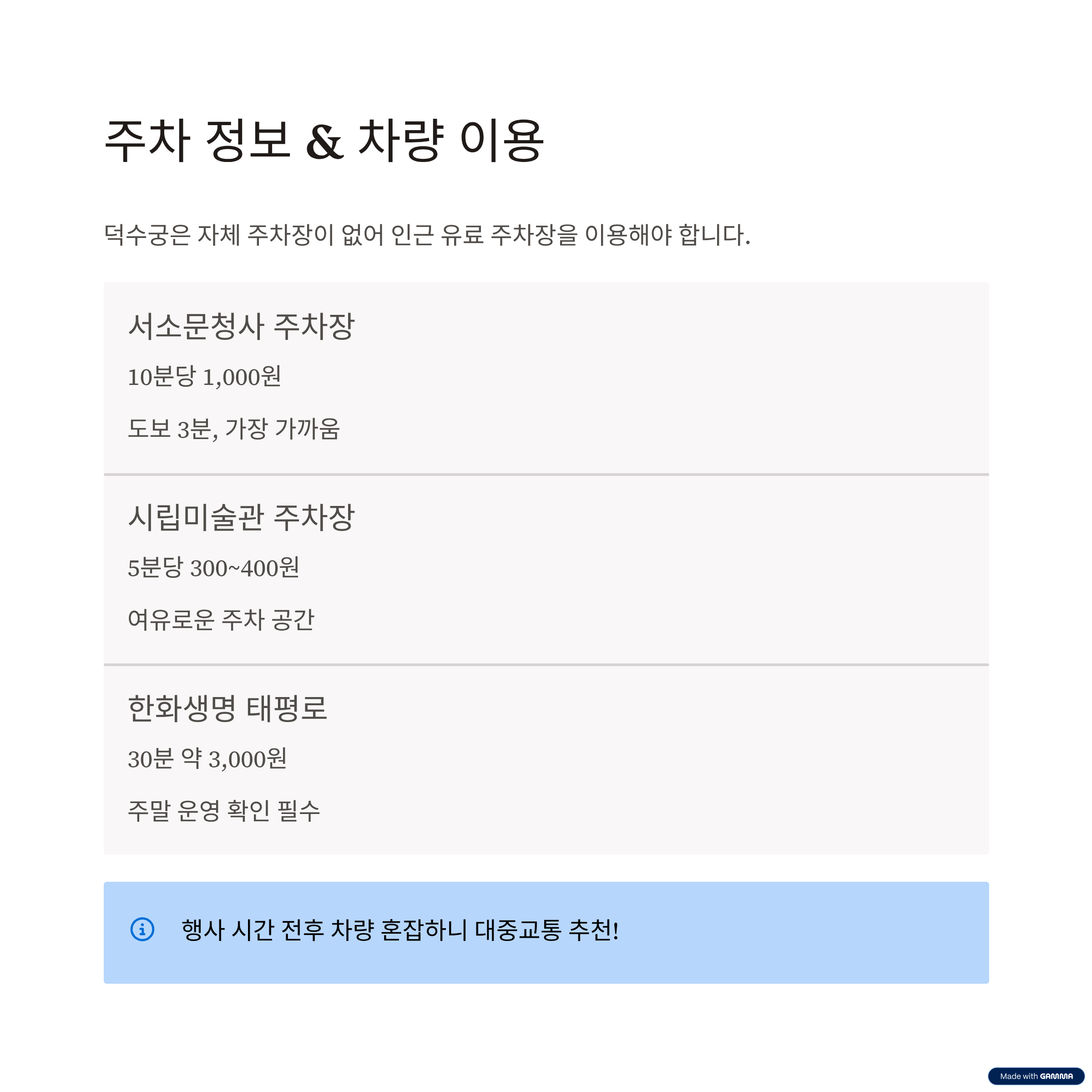 덕수궁은 자체 주차장이 없습니다. 차량 이용 시 인근 유료 주차장을 이용해야 합니다.