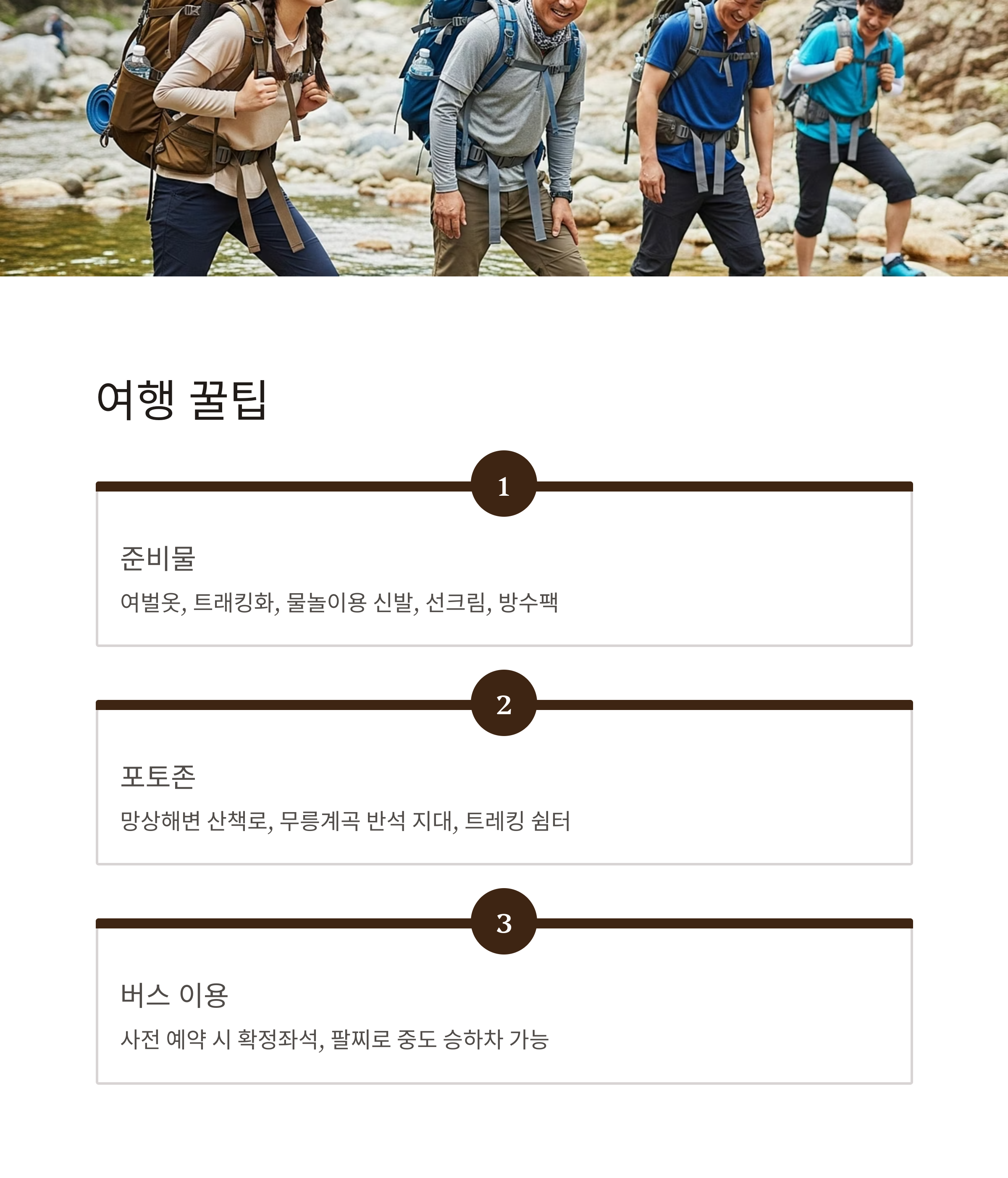 복장 및 준비물 여벌옷, 트래킹화, 물놀이 가능한 신발, 선크림, 방수팩 등 필수