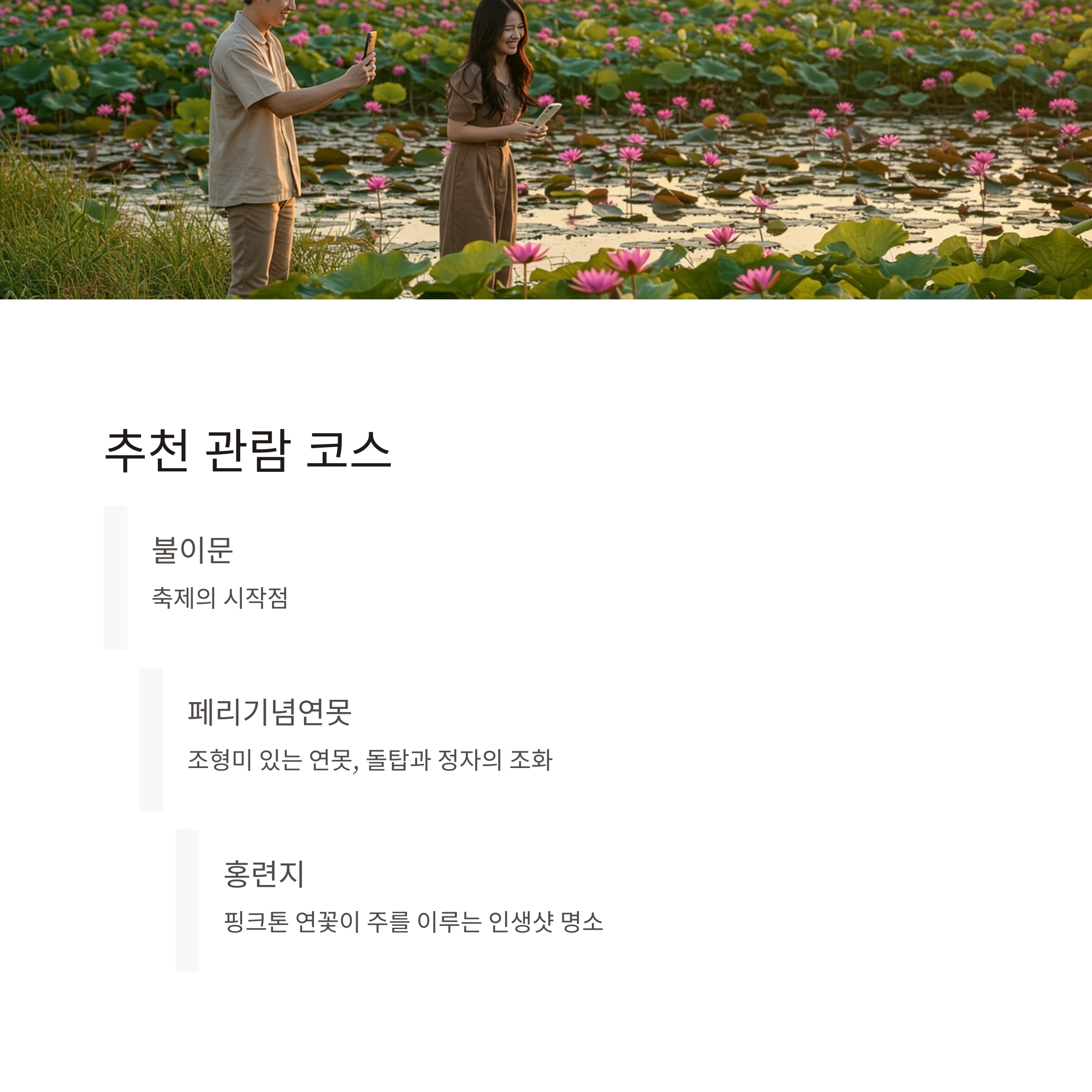 | 홍련지 | 핑크톤 연꽃이 주를 이뤄 인생샷 명소로 손꼽힘 |