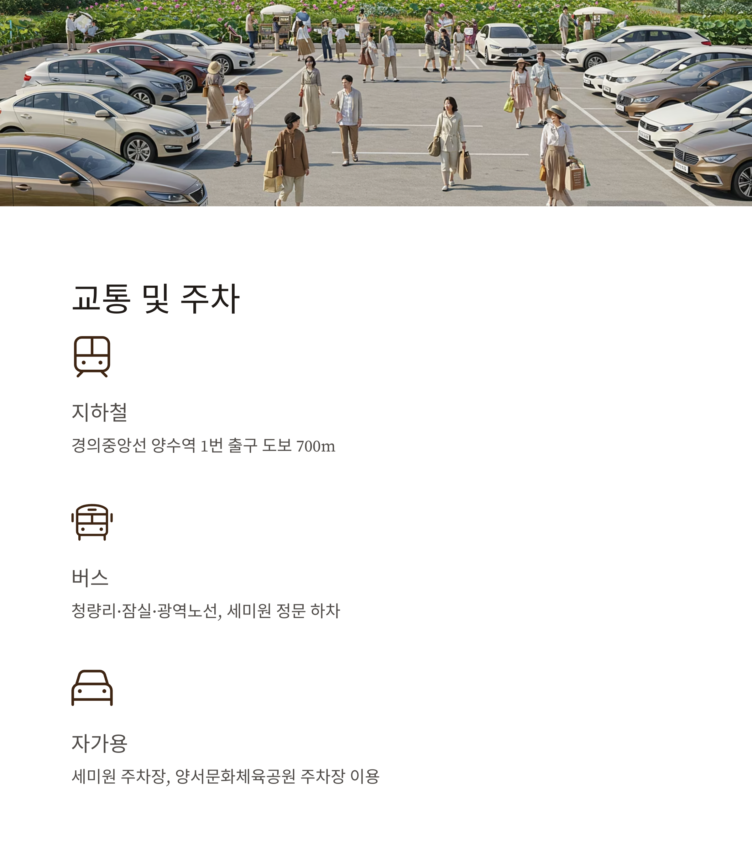 | 자가용 | 세미원 주차장, 양서문화체육공원 주차장 모두 이용 가능 |