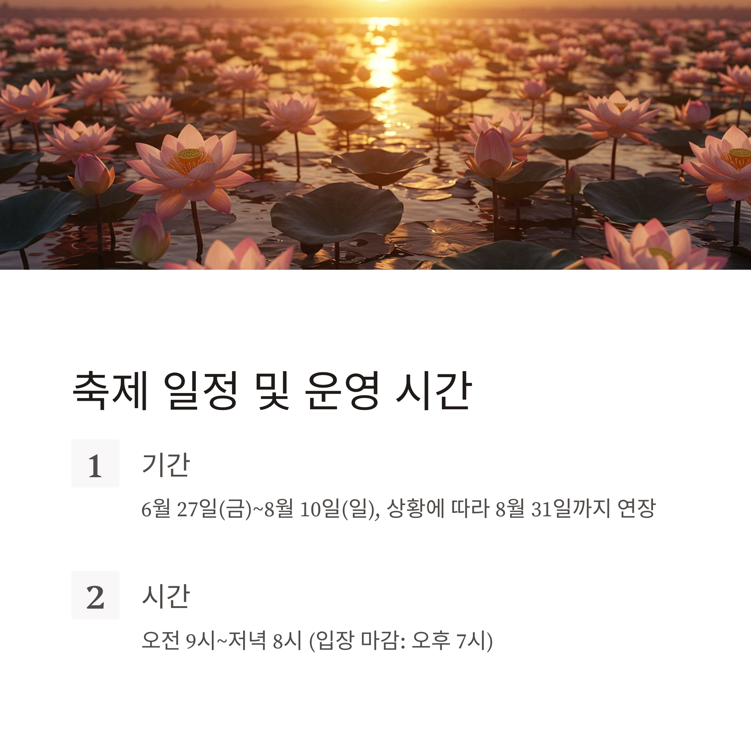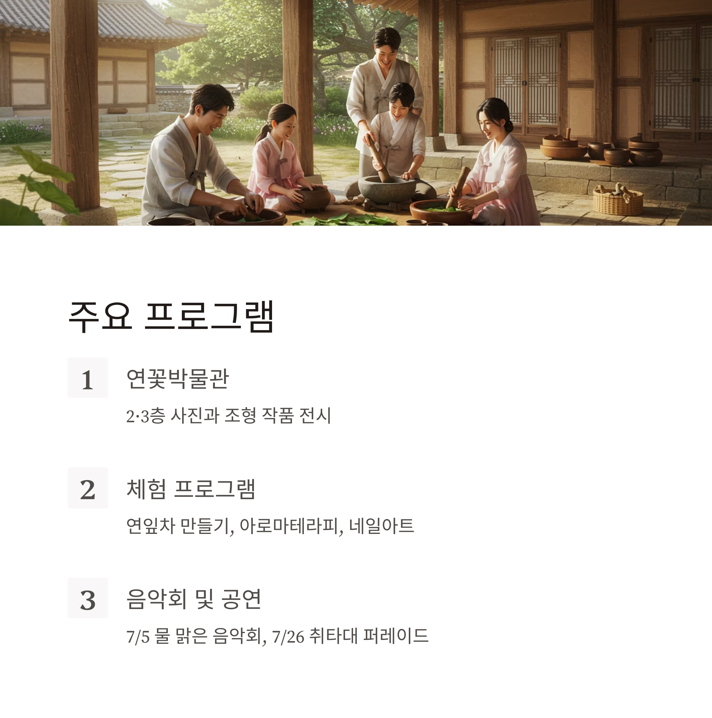 대표 일정은 7/5(물 맑은 음악회), 7/26(취타대 퍼레이드) 등입니다. - 연꽃 플리마켓