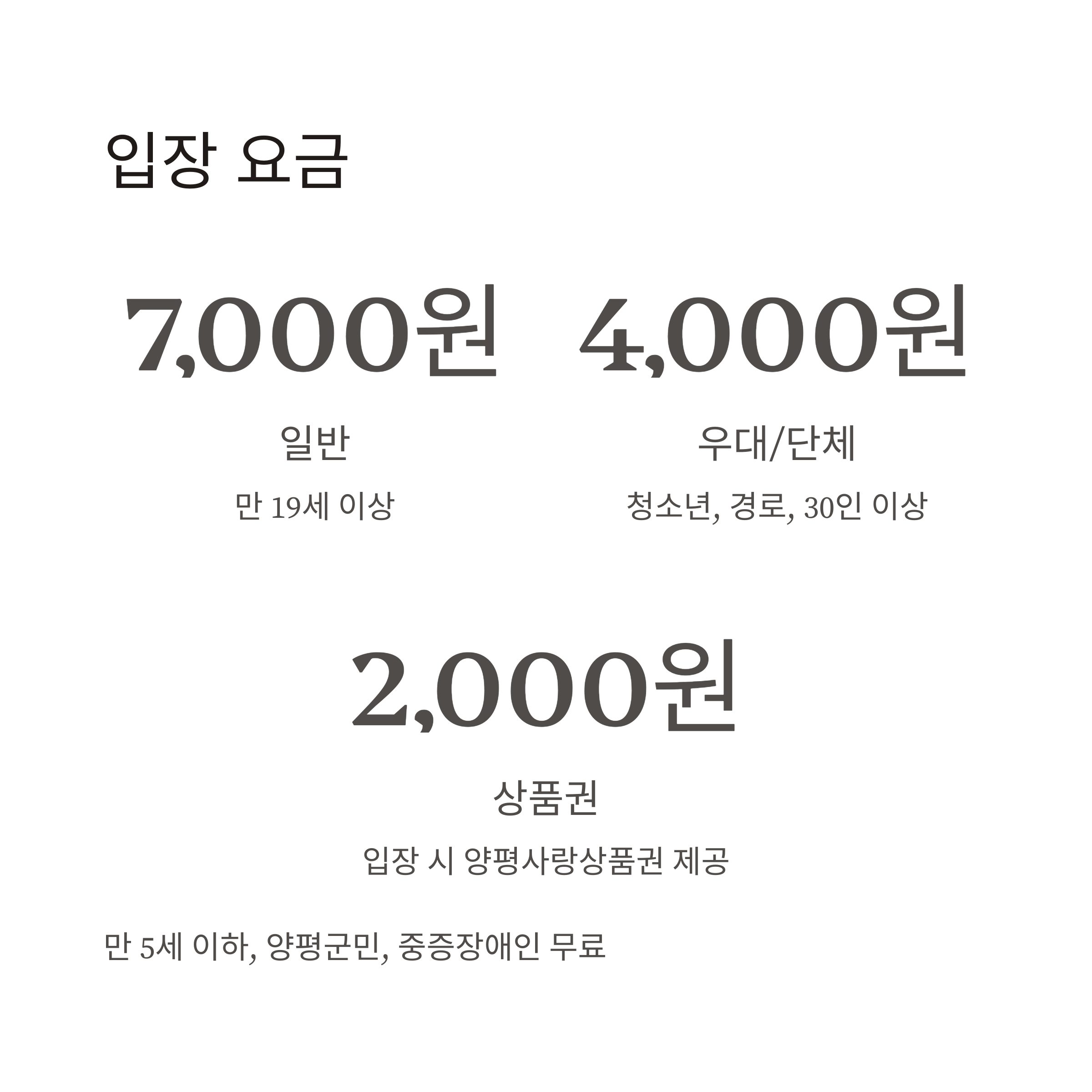 | 무료 대상 | 만 5세 이하, 양평군민, 중증장애인 등 |