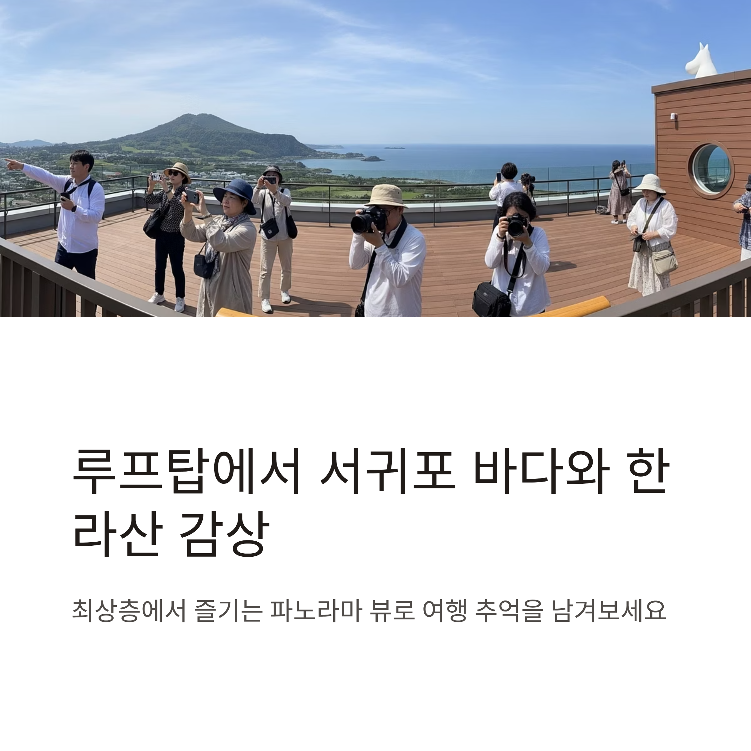 전시관 최상층 루프탑에서는 날씨가 좋을 때 서귀포 앞바다와 한라산의 파노라마 뷰를 감상할 수 있습니다.