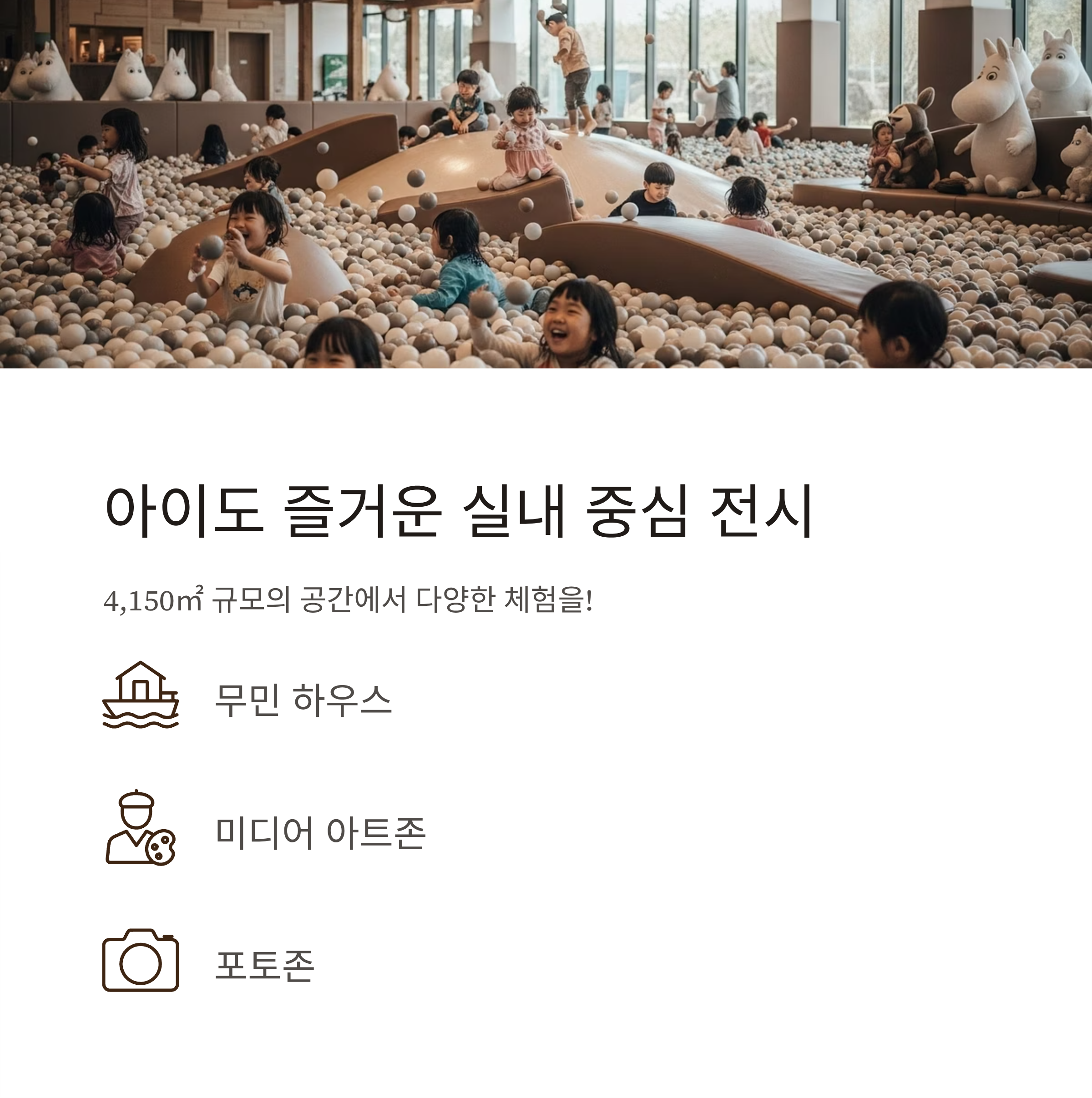 무민 하우스, 미디어 아트존, 볼풀존, 포토존, 목공 체험실 등이 마련되어 있습니다.