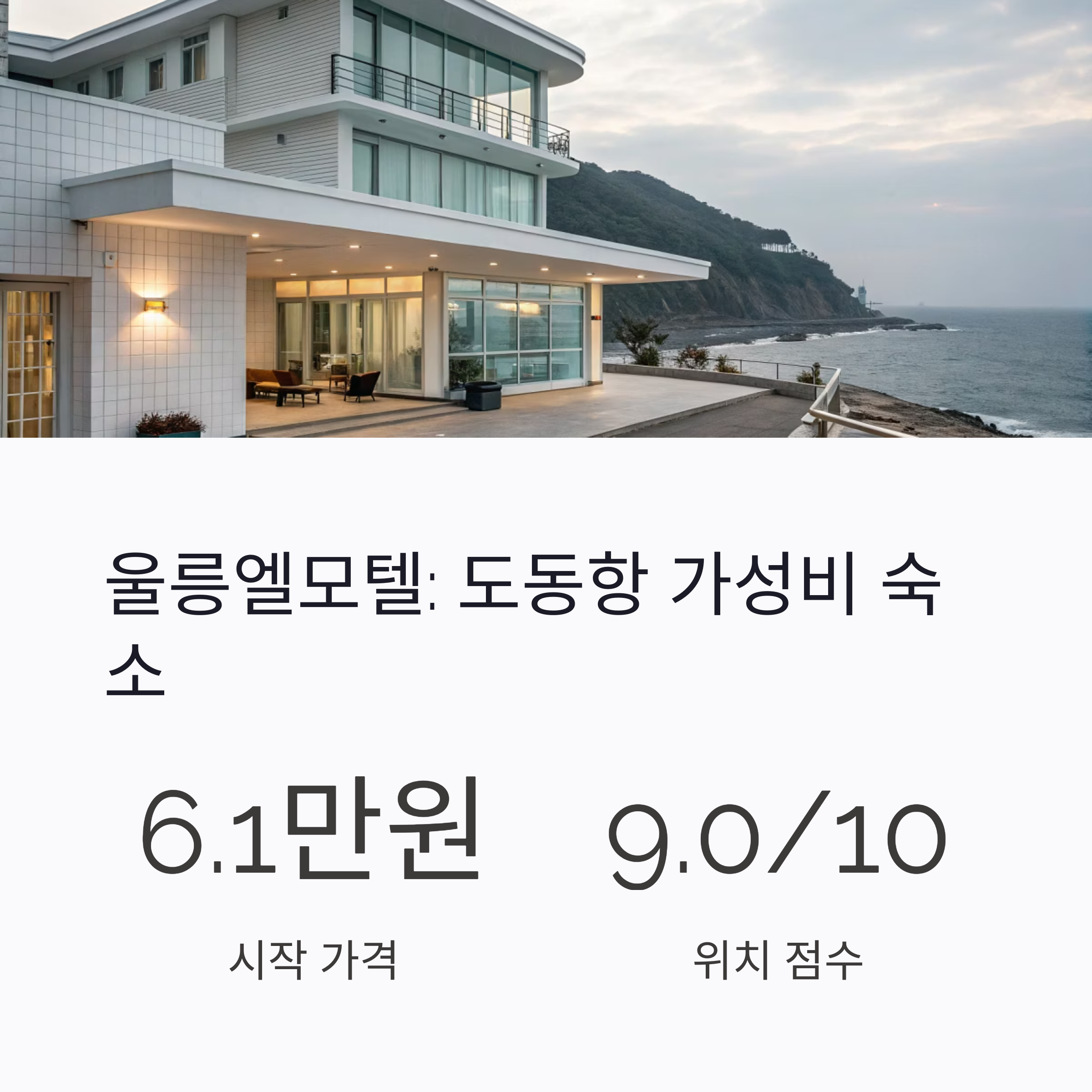 | 울릉엘모텔 | 6.1만~7.1만 원 | “가성비 최고”, “위치 9점” |