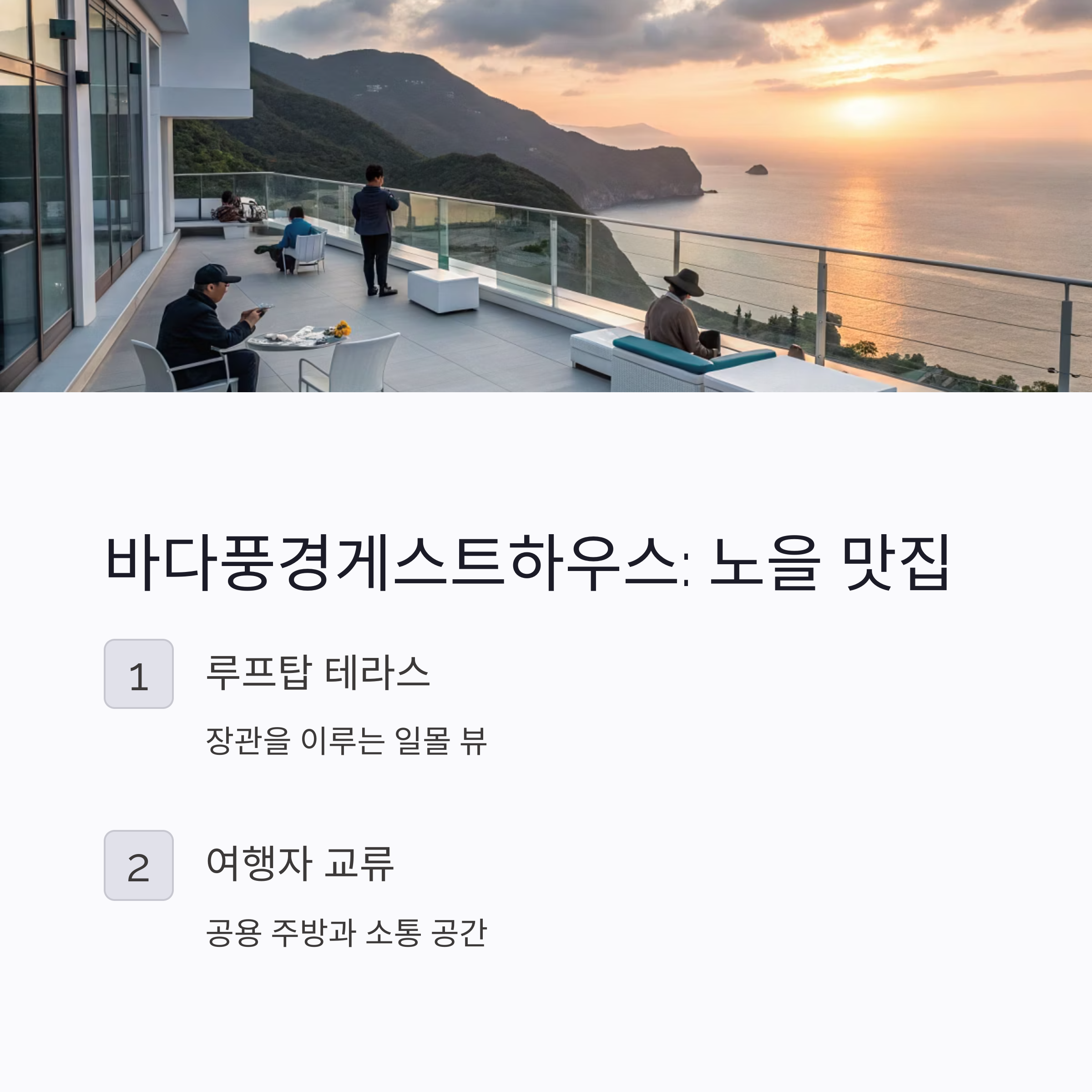 | 바다풍경게스트하우스 | 13.6만~15만 원 | “노을맛집”, “사장님 친절” |