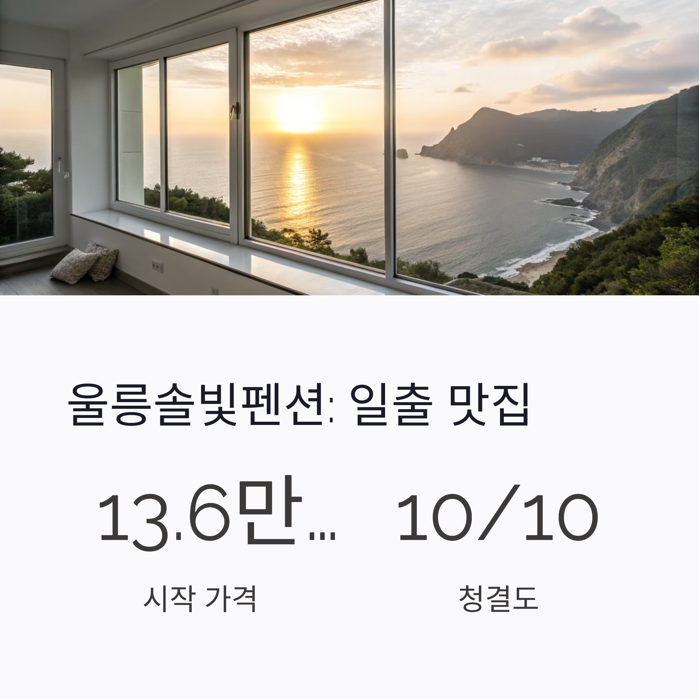 | 울릉솔빛펜션 | 13.6만~15만 원 | “청결 최고”, “지금까지 중 최고” |