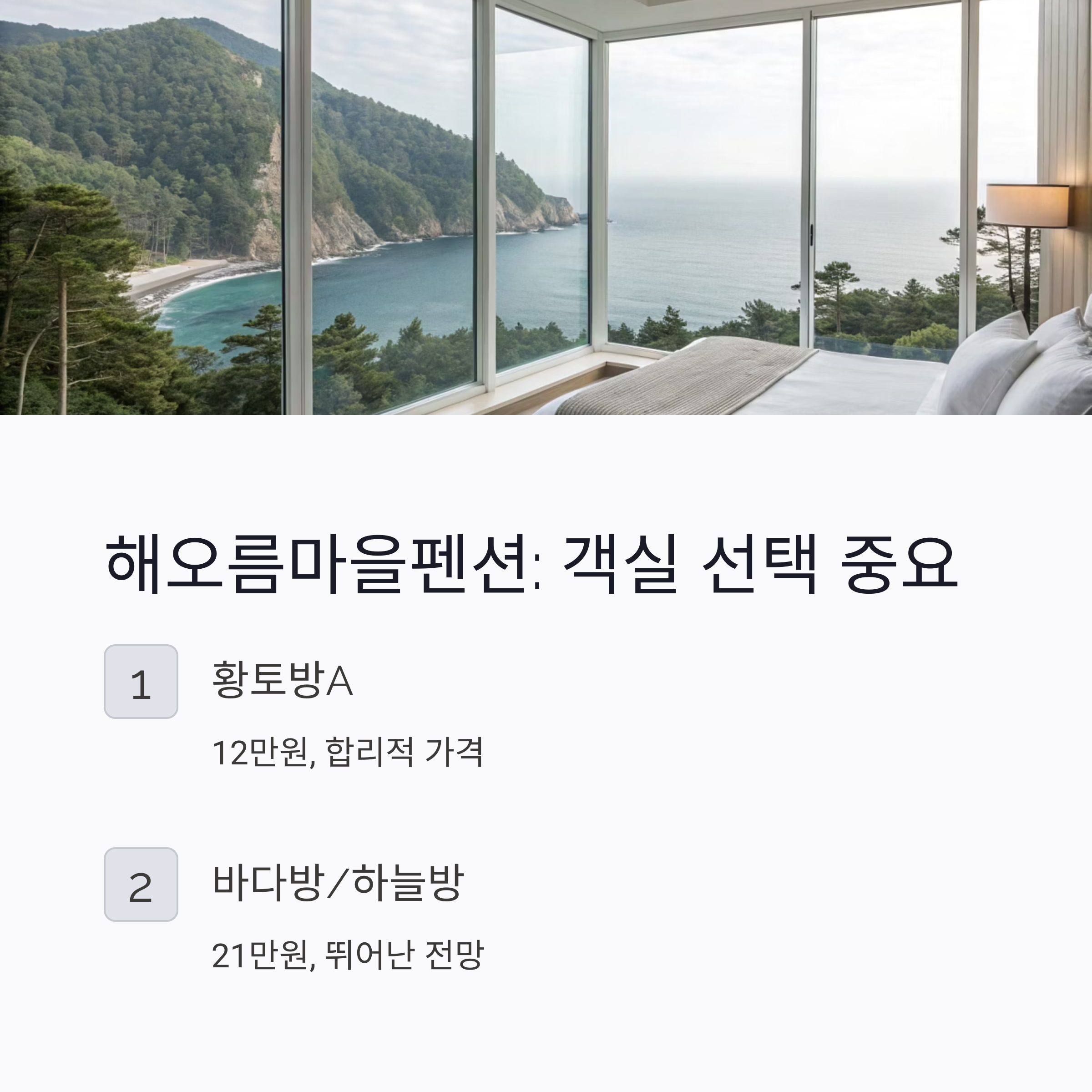 | 바다방/하늘방 | 210,000원 | 전망 뛰어남, 만족도 높은 고급 옵션 선택 필요 |
