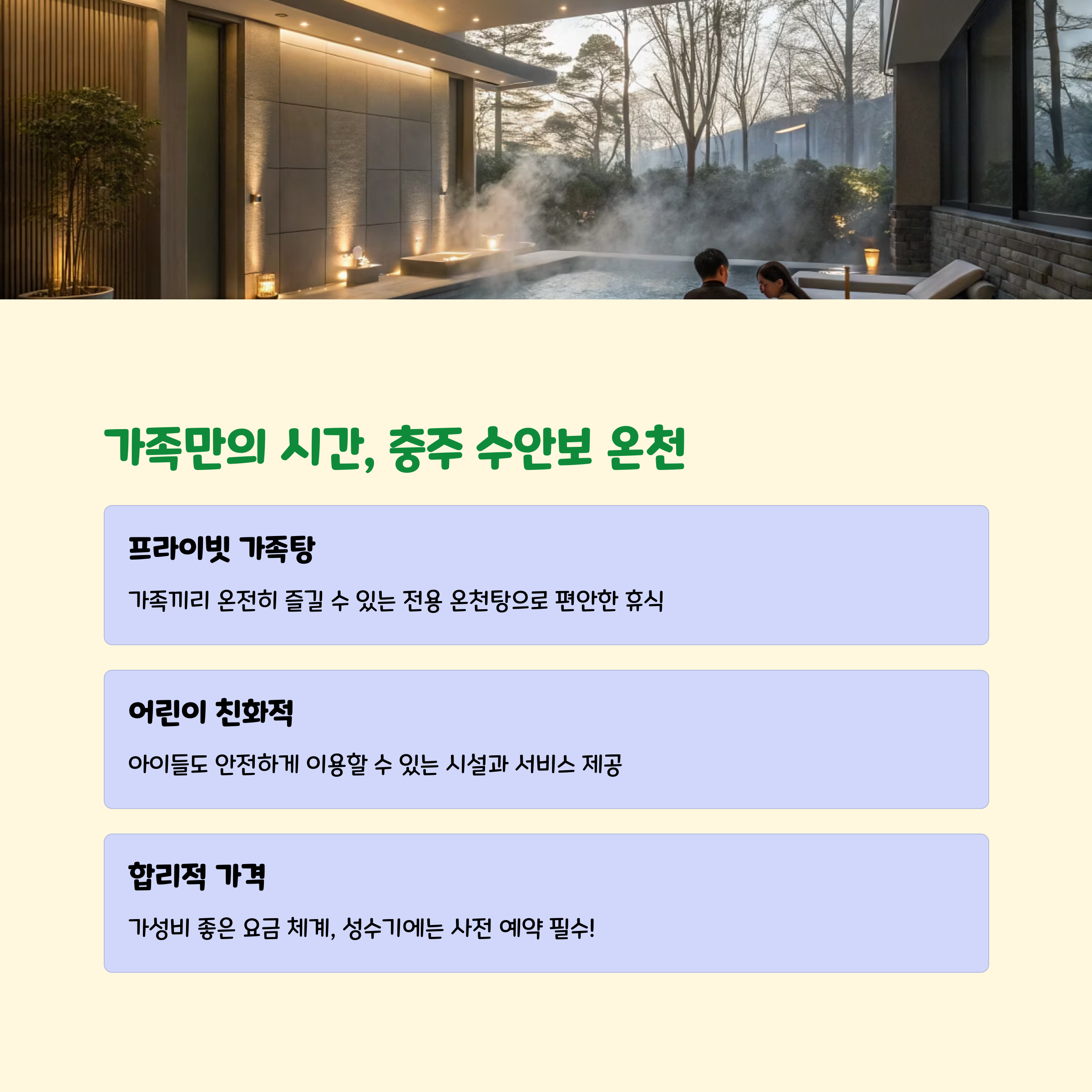 충주 수안보 온천은 보다 프라이빗한 가족탕 경험을 제공하며, 합리적인 가격도 장점입니다.