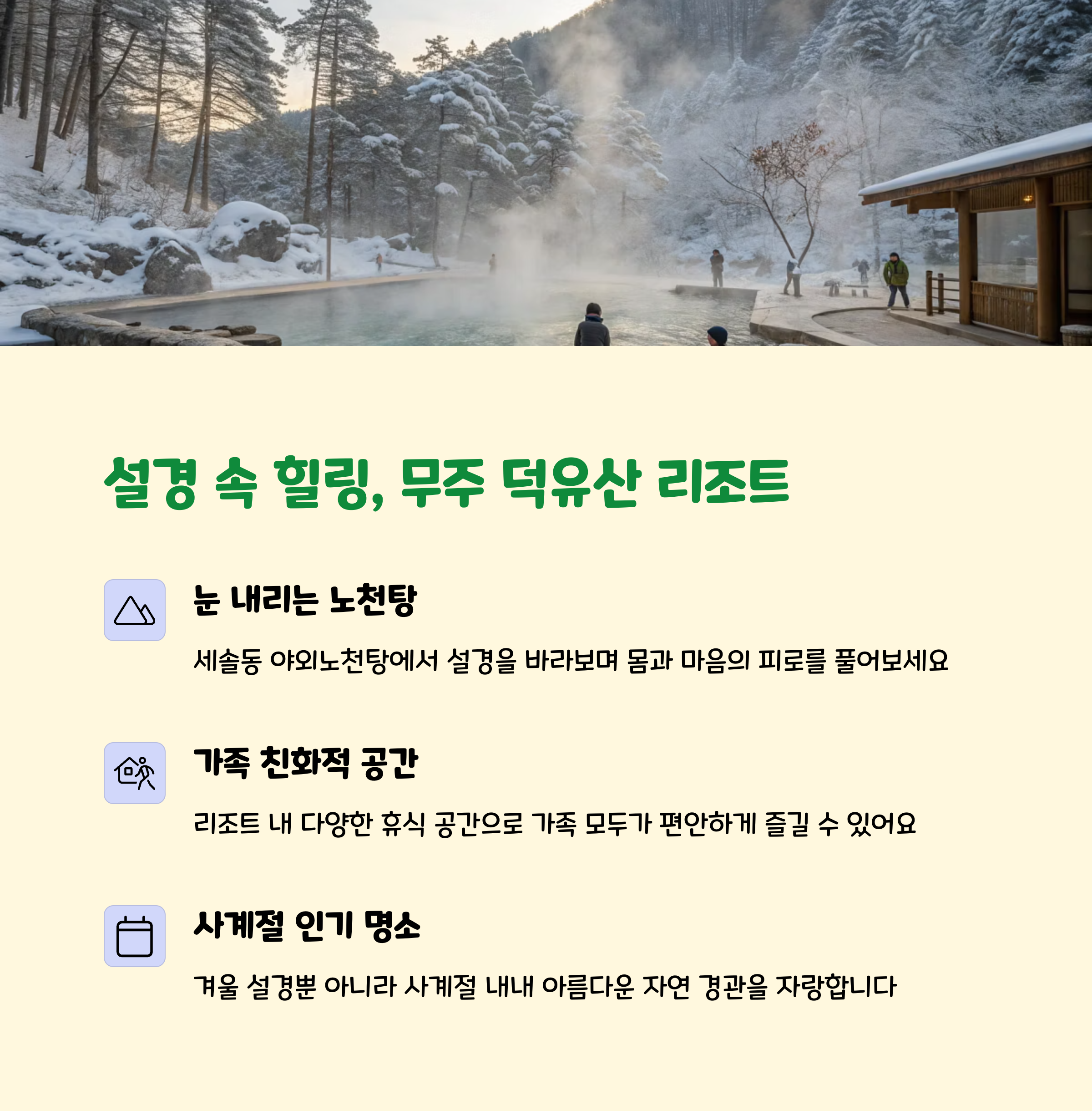 | 무주 | 덕유산 리조트 | 스키와 온천의 하모니 | 지역 약초 요리 |