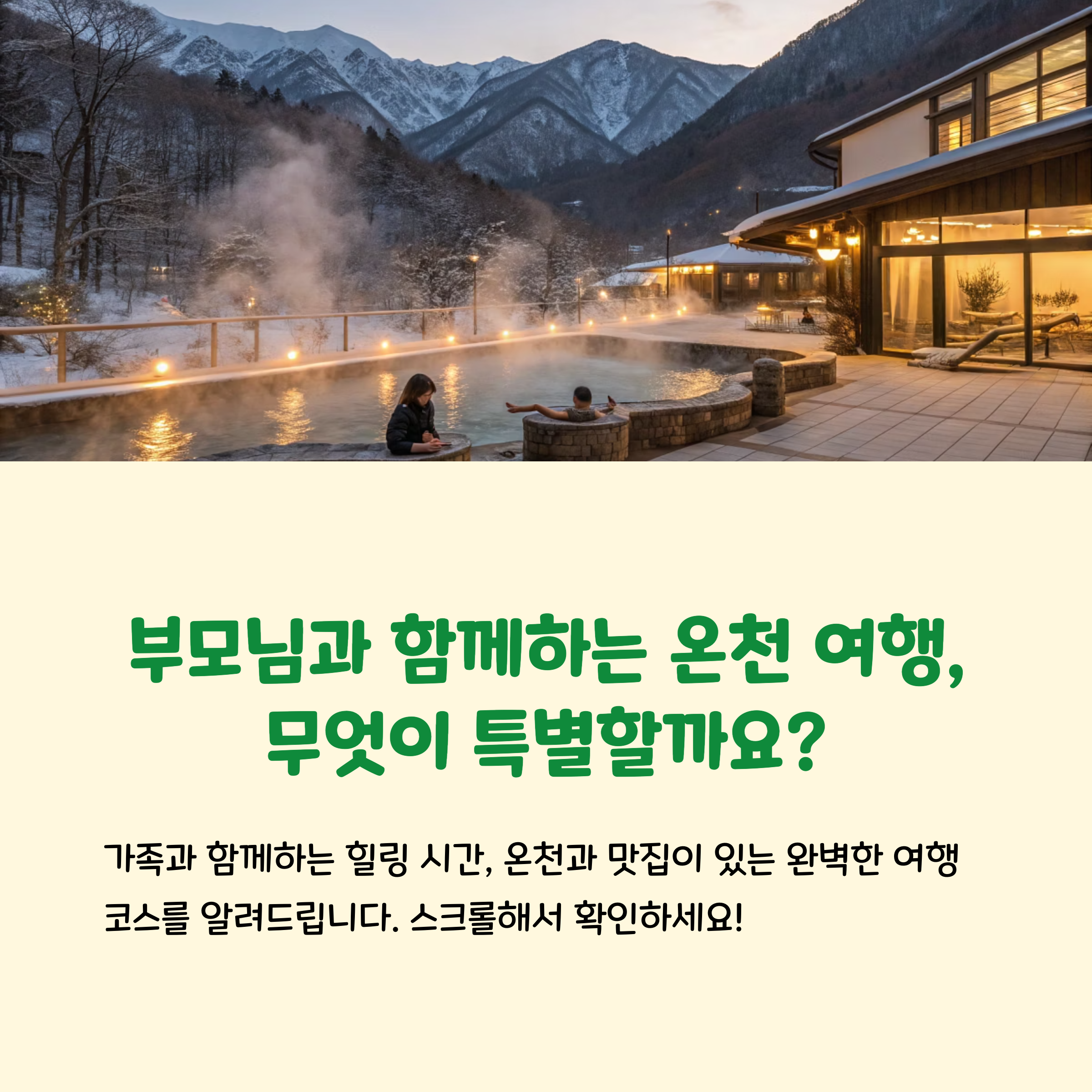 온천 여행은 부모님과 함께 힐링하며 몸과 마음을 함께 치유할 수 있는 최고의 선택입니다.