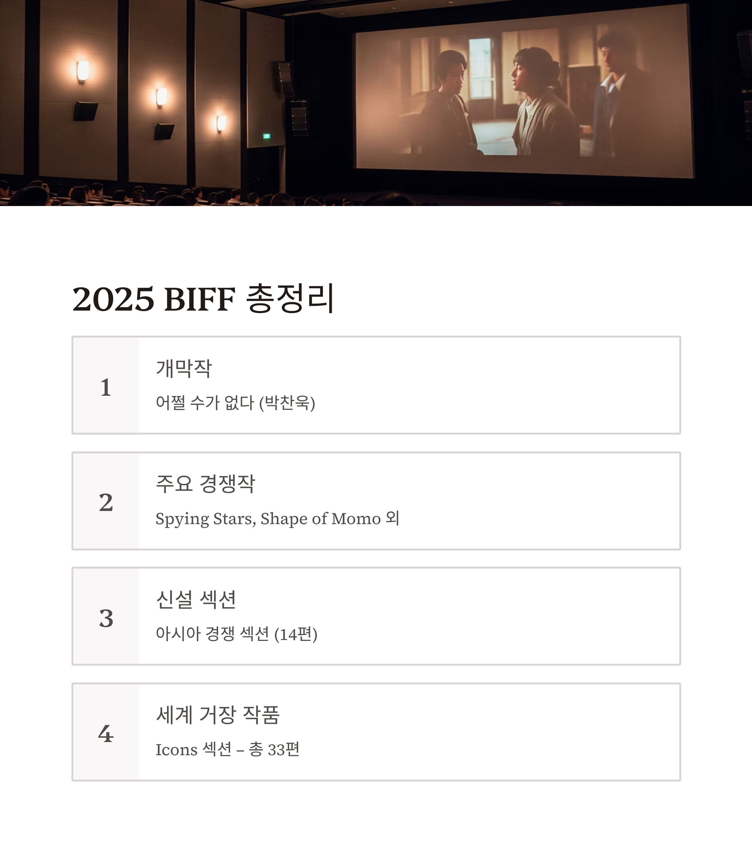 2025 BIFF는 단순한 영화제가 아니라, 글로벌 영화산업의 흐름과 아시아 영화의 미래를 동시에 조망할 수 있는 장입니다.