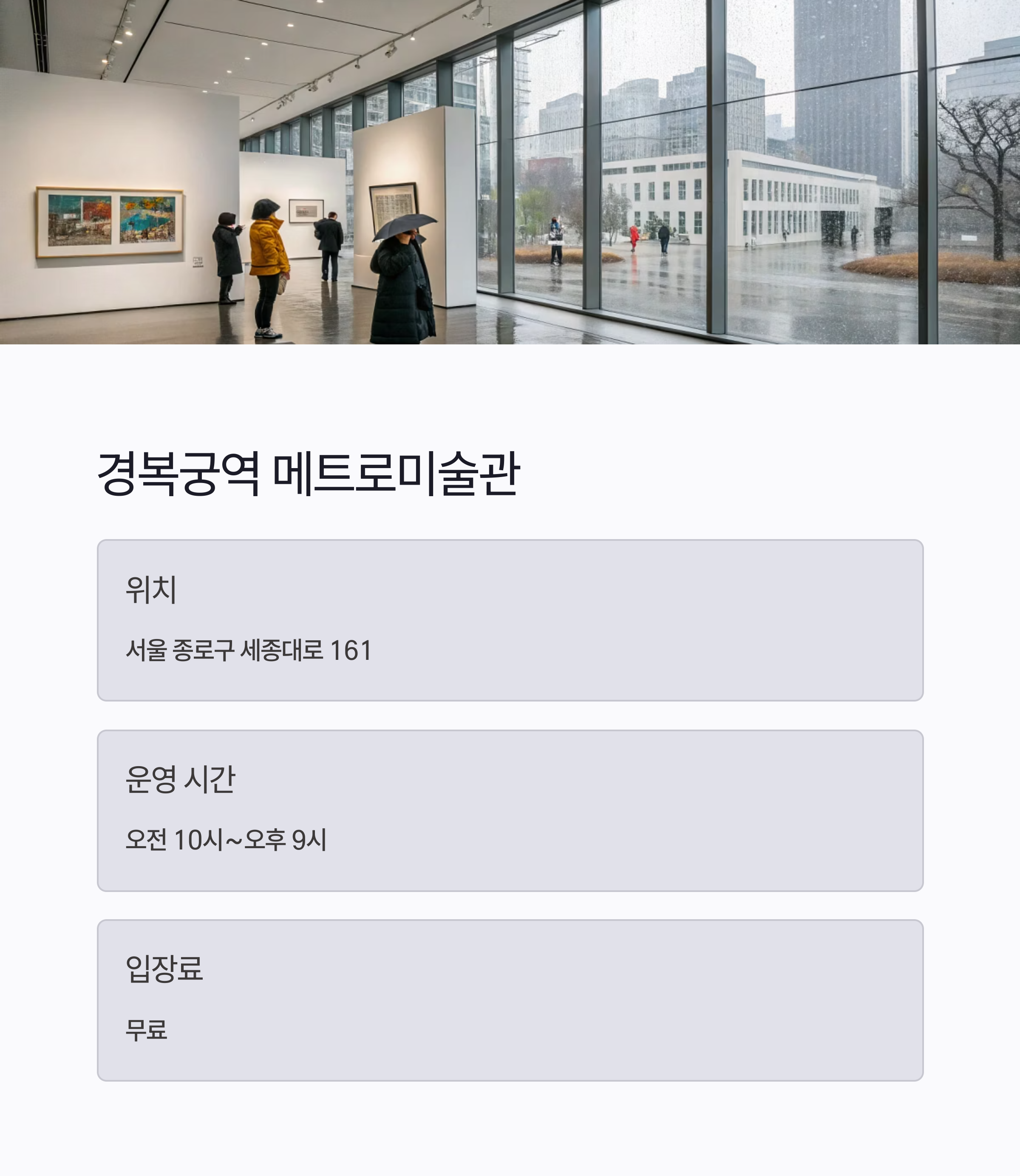 | 경복궁역 메트로미술관 | 서울 종로구 | 10:00 - 21:00 | 별도 주차 지원 없음 |