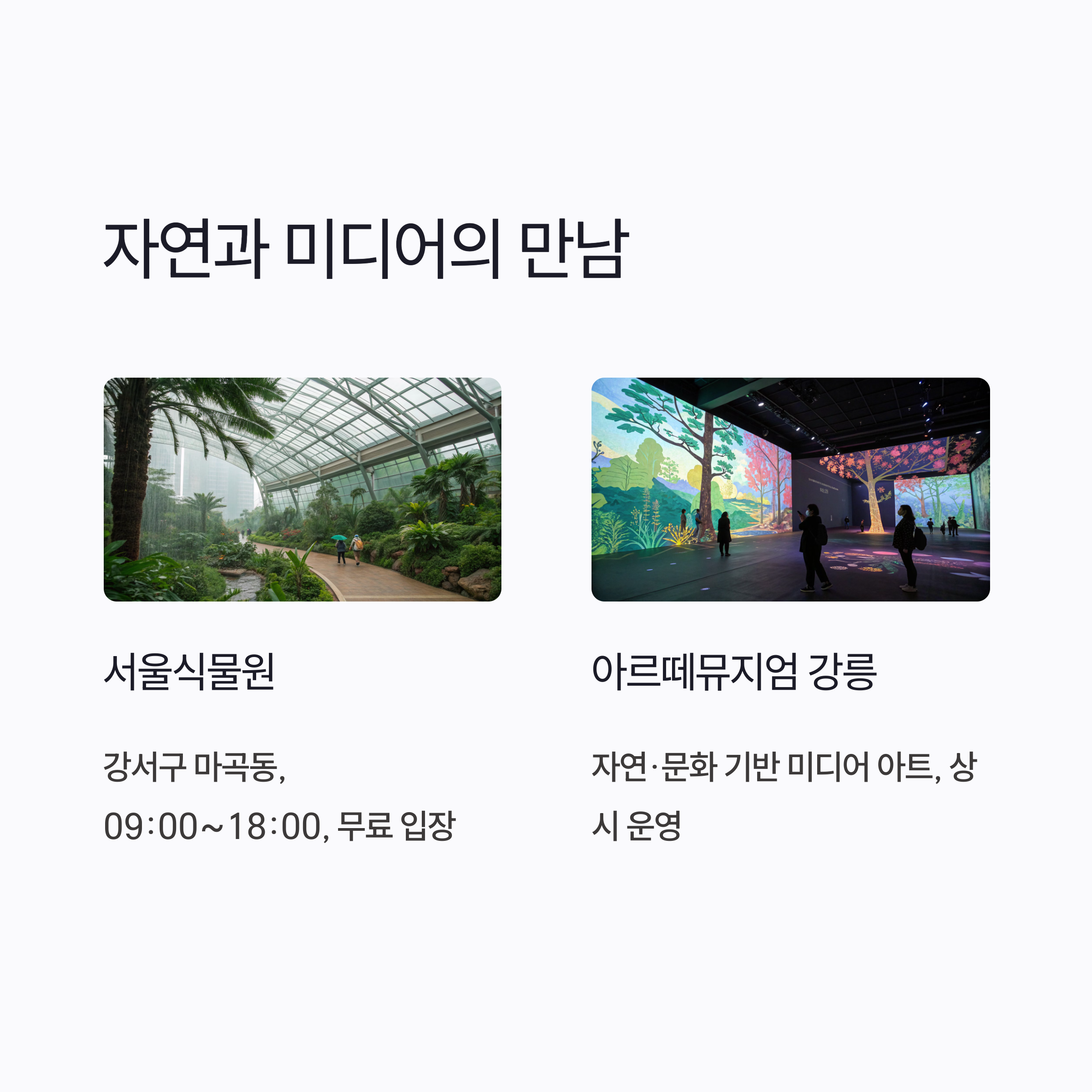 전국적 명소와 비교했을 때, 서울 내 전시는 대중교통과 실내 환경이 중심입니다.