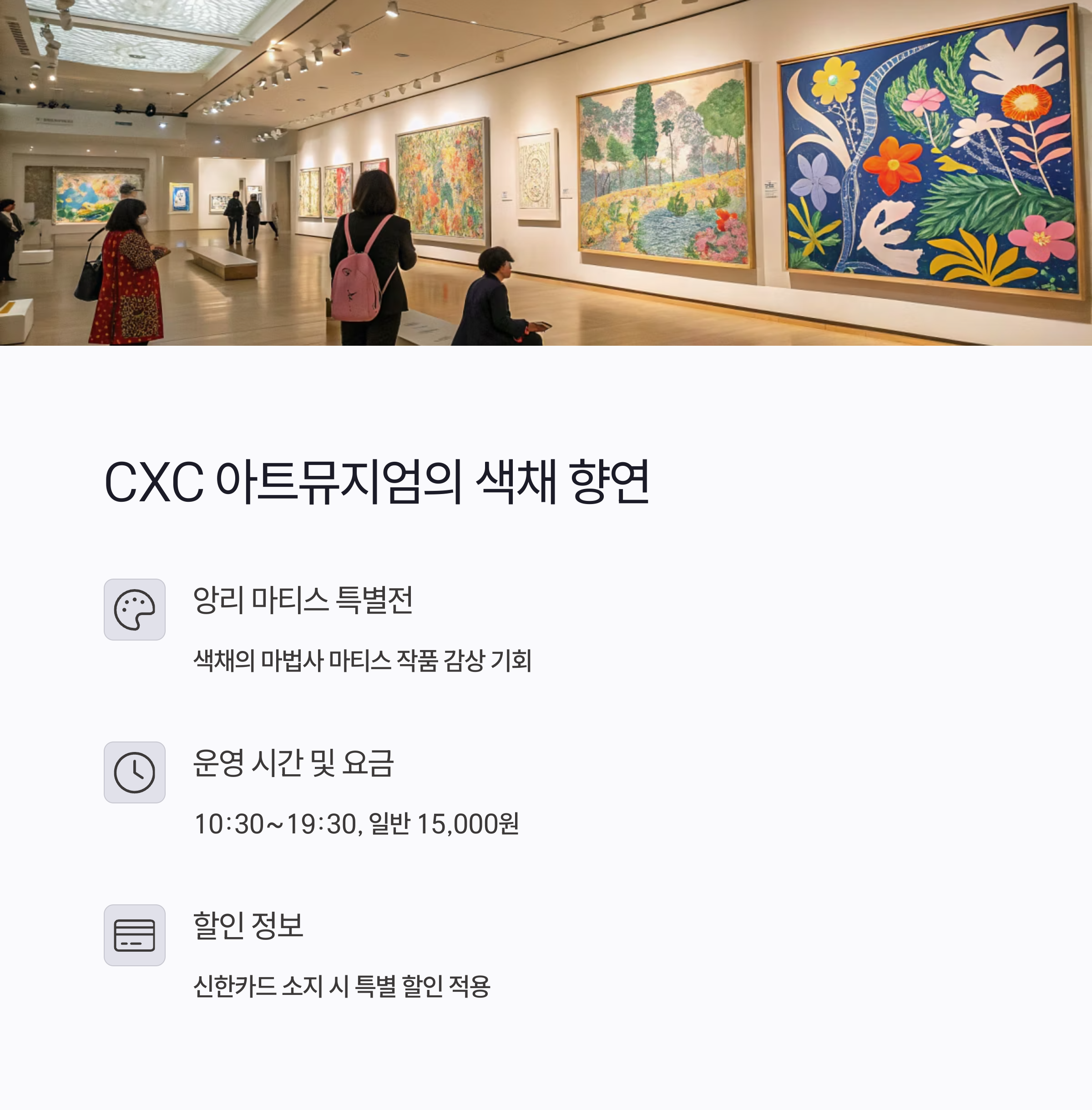 앙리 마티스 특별전은 광진구 CXC 아트뮤지엄에서 열리고 있어 접근이 편리하며, 주차 조건도 우수합니다.