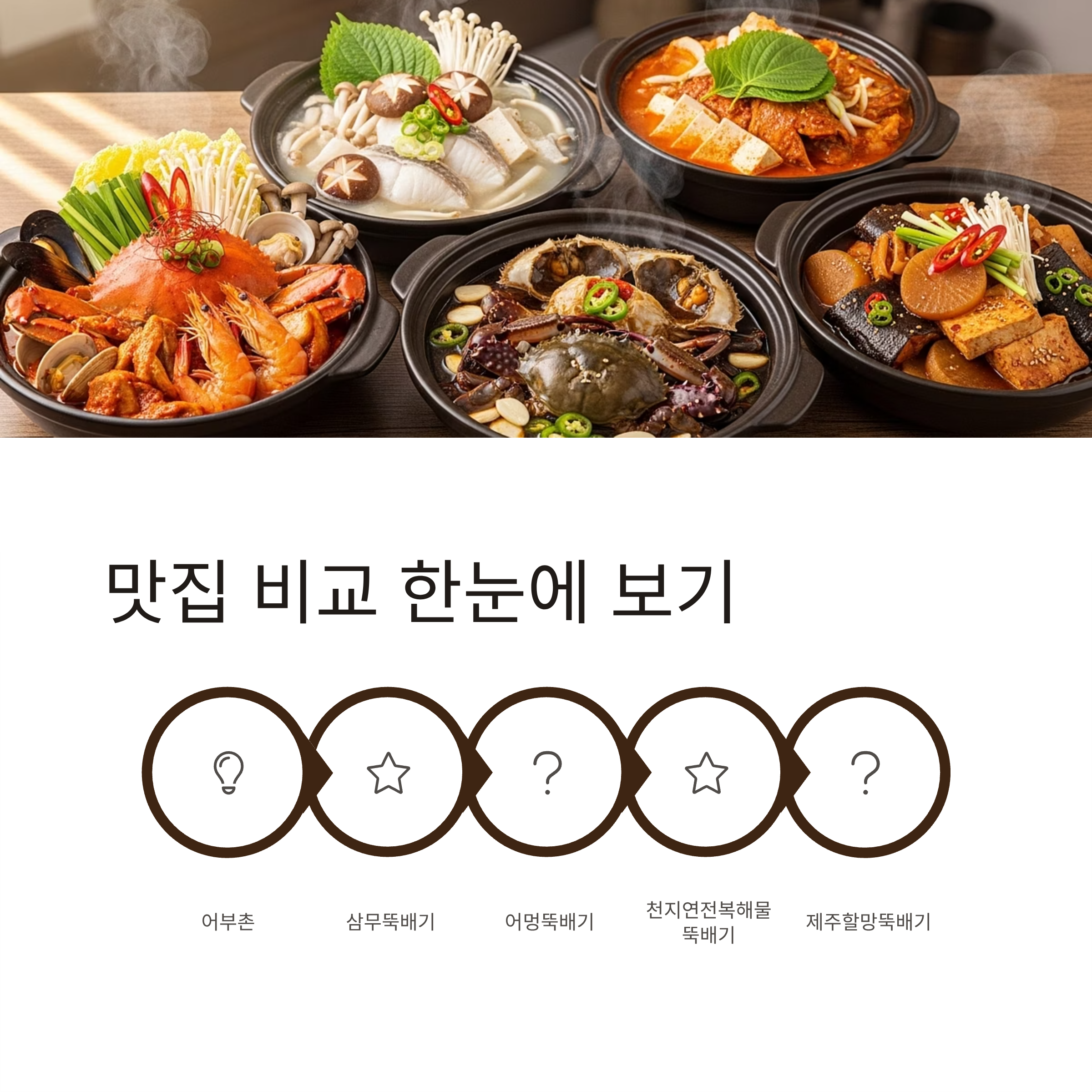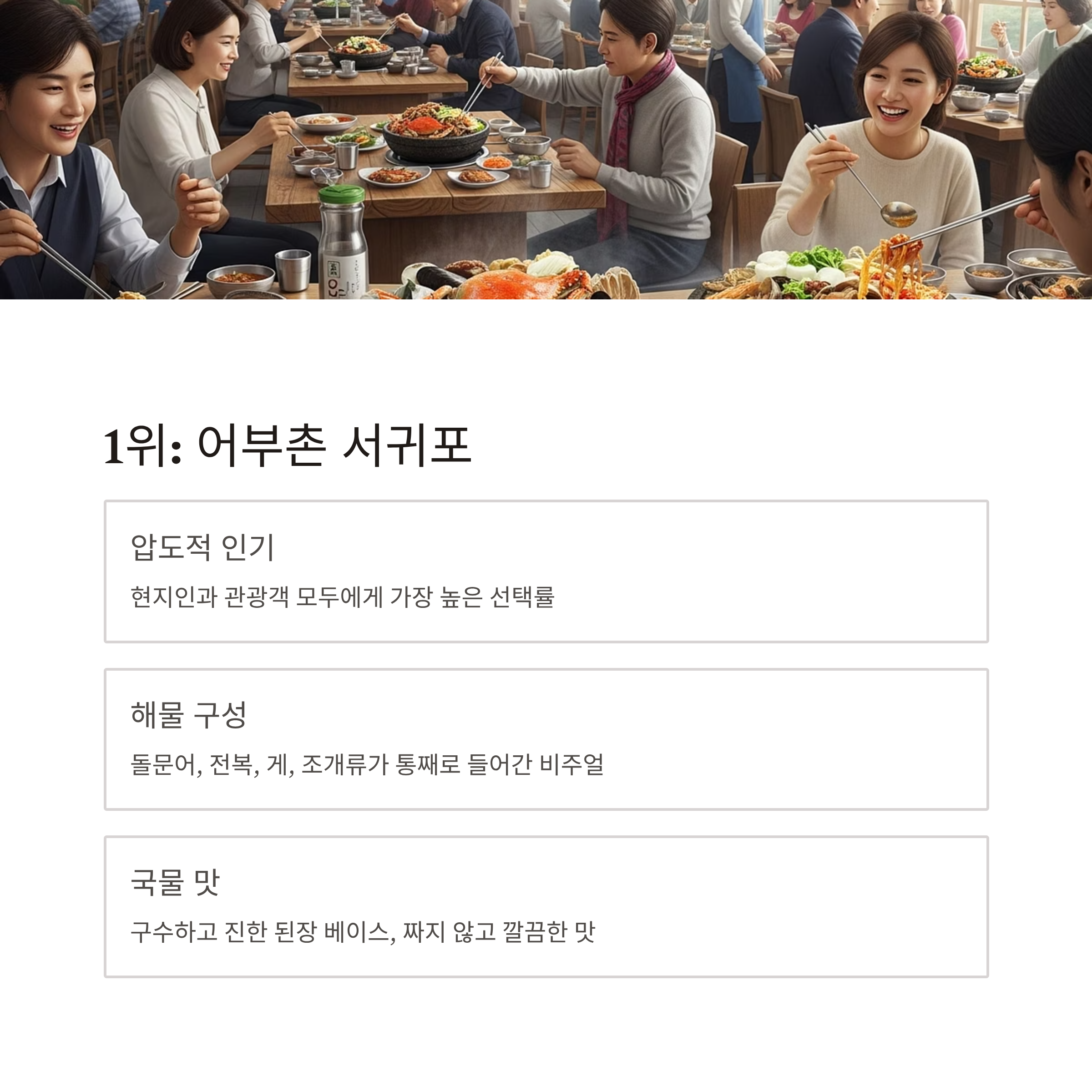 | 1 | 어부촌 서귀포 | 돌문어·전복·조개·게 등 | 해물 구성 압도적, 비주얼·국물 최고 |