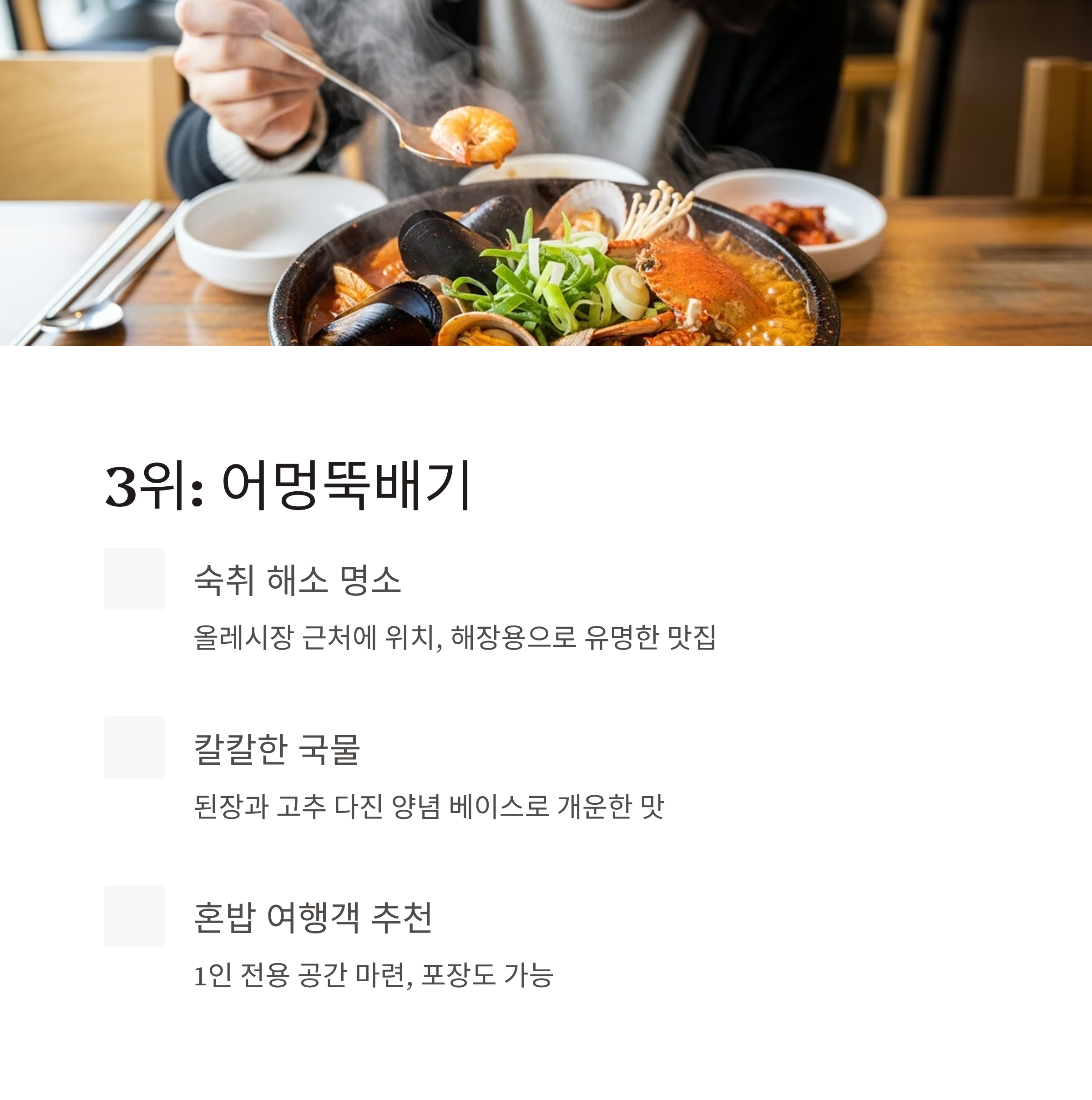 | 3 | 어멍뚝배기 | 전복·홍합·조개·게 | 해장용 뚝배기로 인기, 혼밥 편함 |