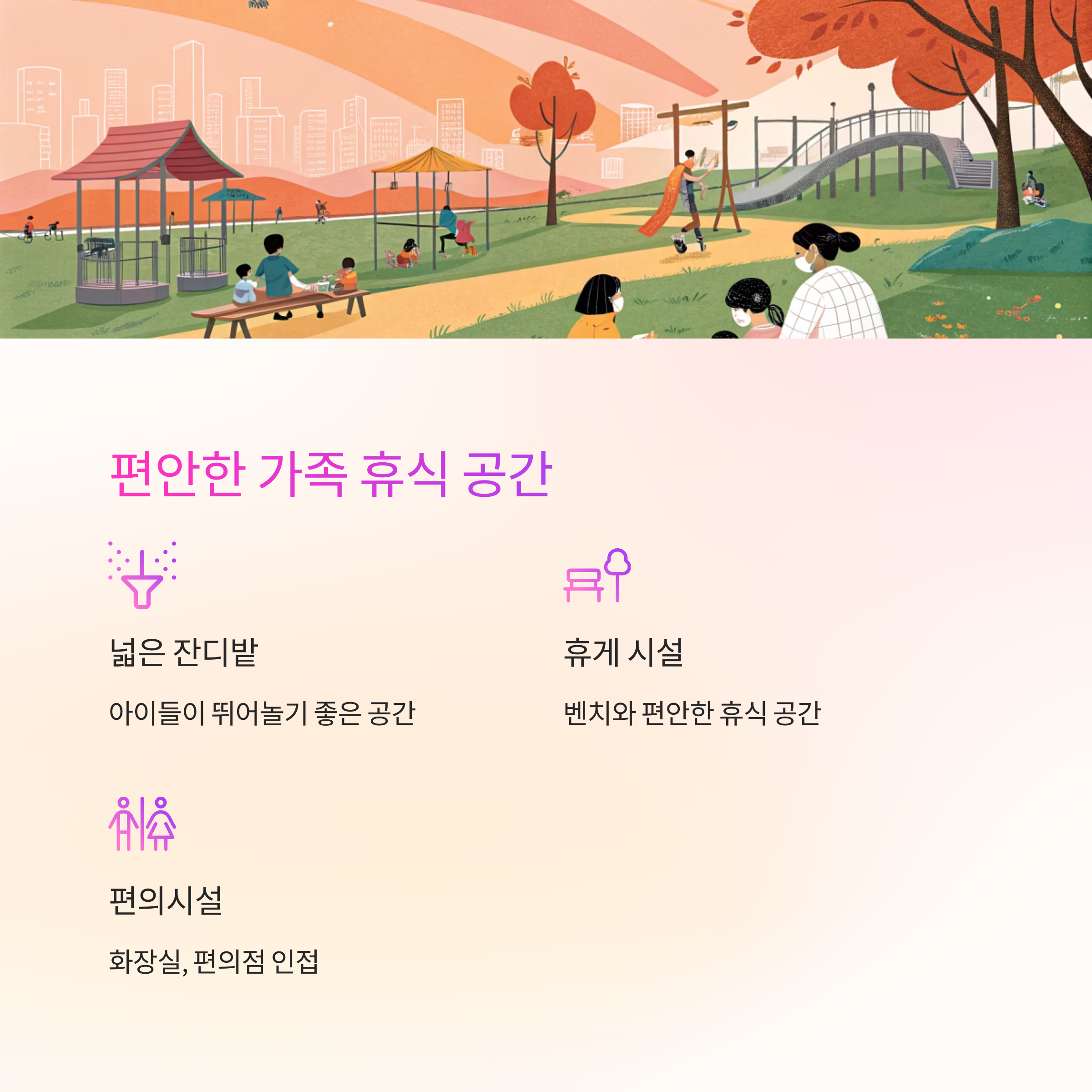 | 편의시설 | 벤치, 화장실, 편의점 | 휴식과 편의 제공 |