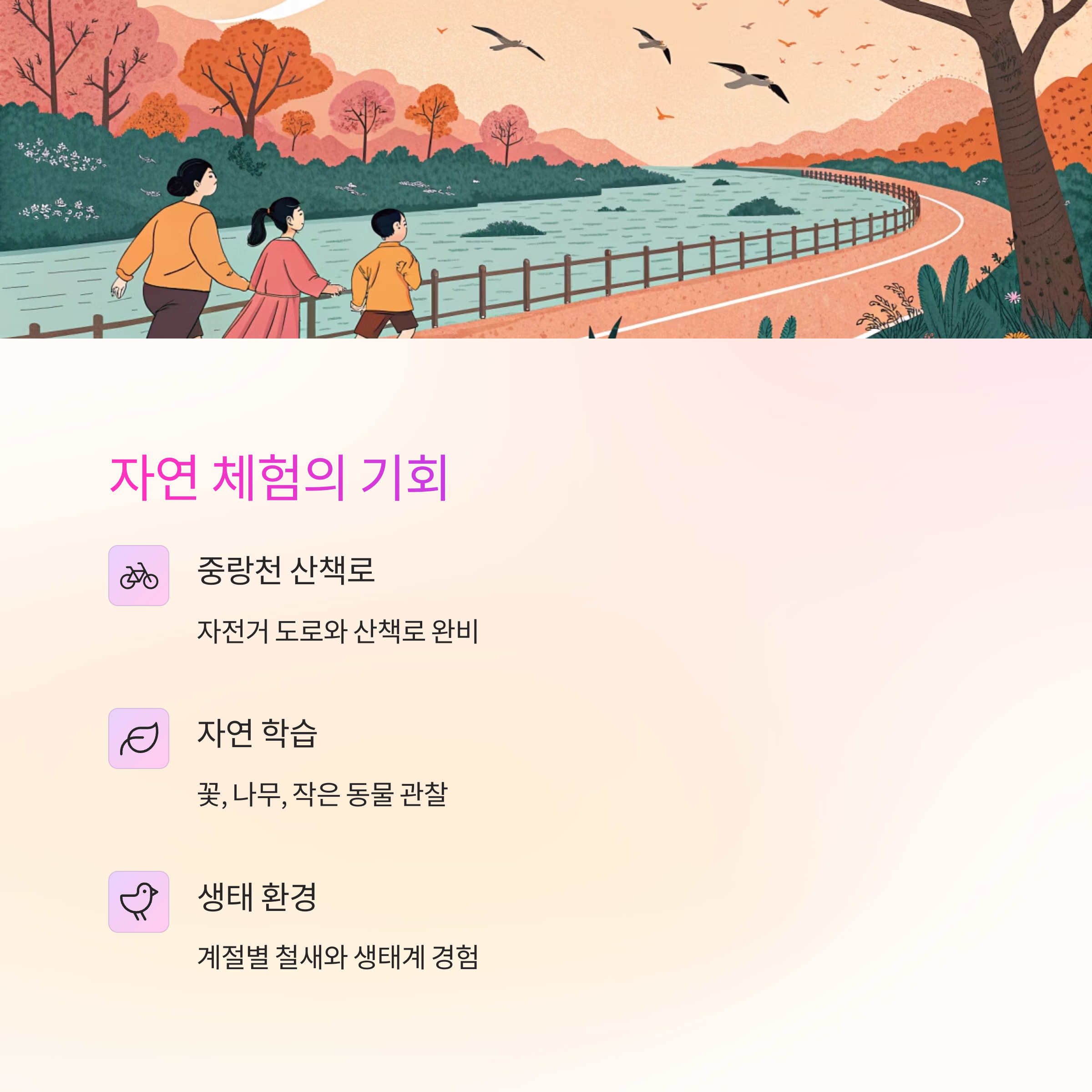 특히 매년 봄철 열리는 중랑천 장미축제는 화려한 장미 꽃길과 다양한 체험 행사로