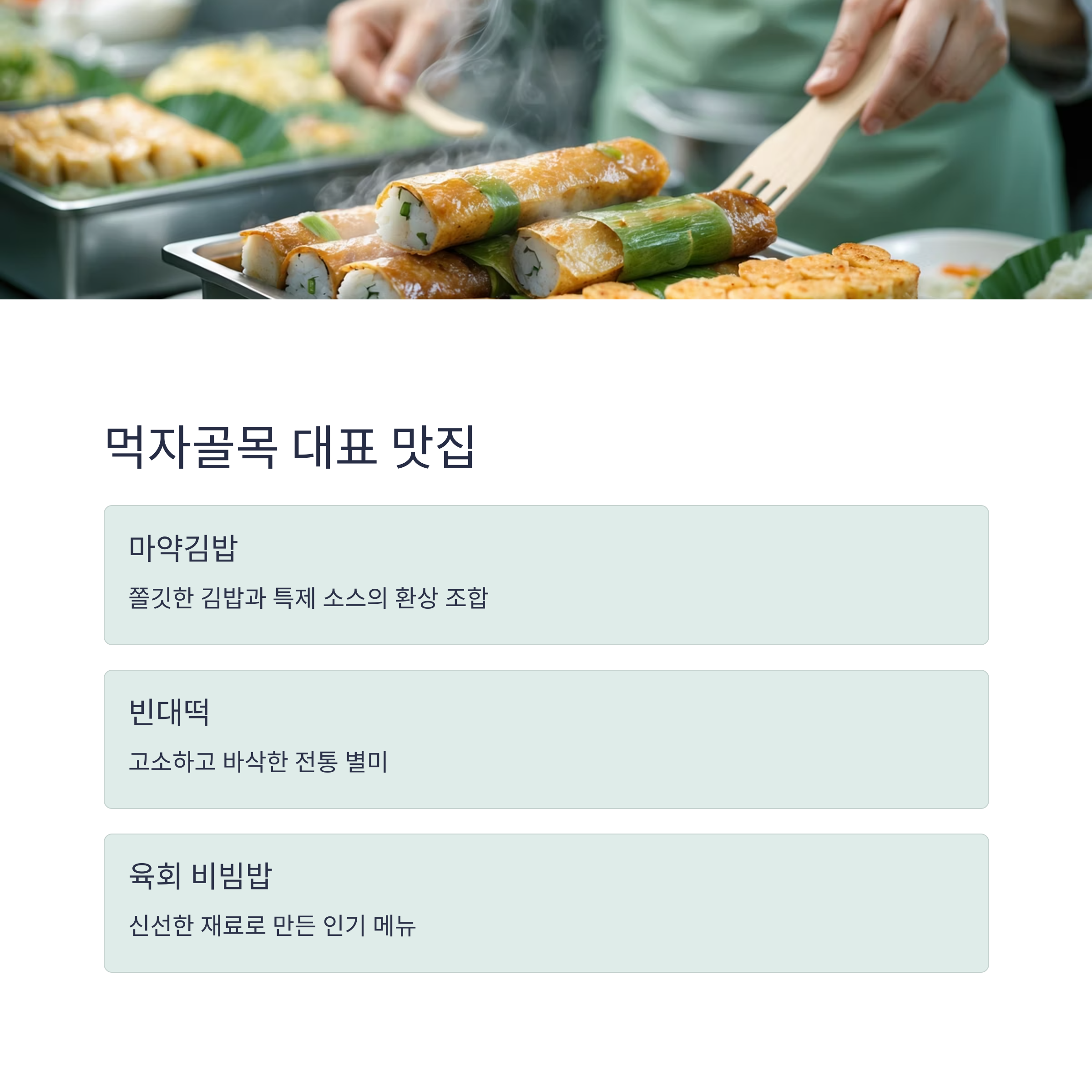 | 먹자골목 | 마약김밥, 빈대떡, 육회 비빔밥 | 길거리 음식의 진수, 다양한 맛 체험 가능 |