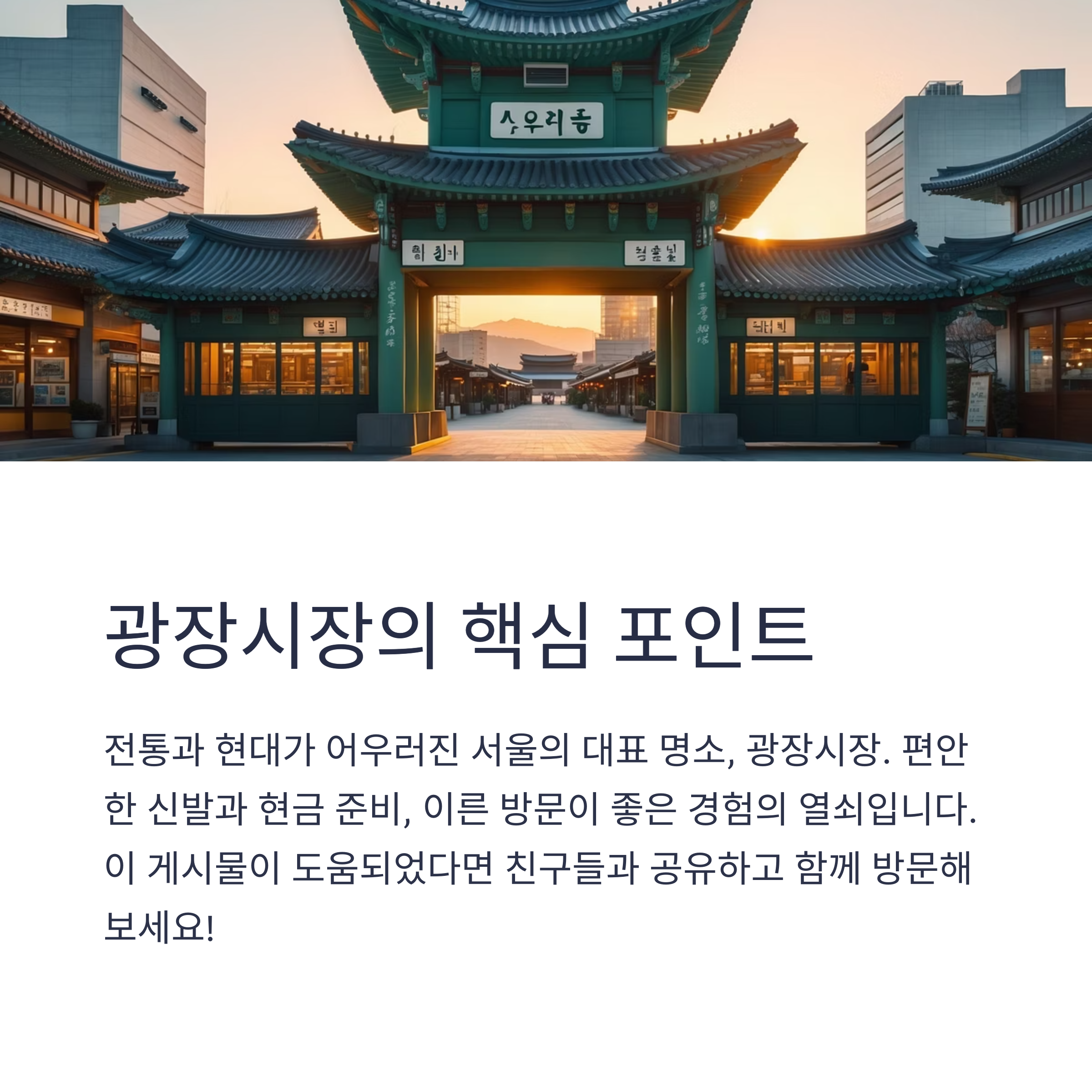 시장 근처에 위치한 ‘북촌 한옥마을’ 산책도 함께 계획하면 여행의 만족도가 높아집니다.