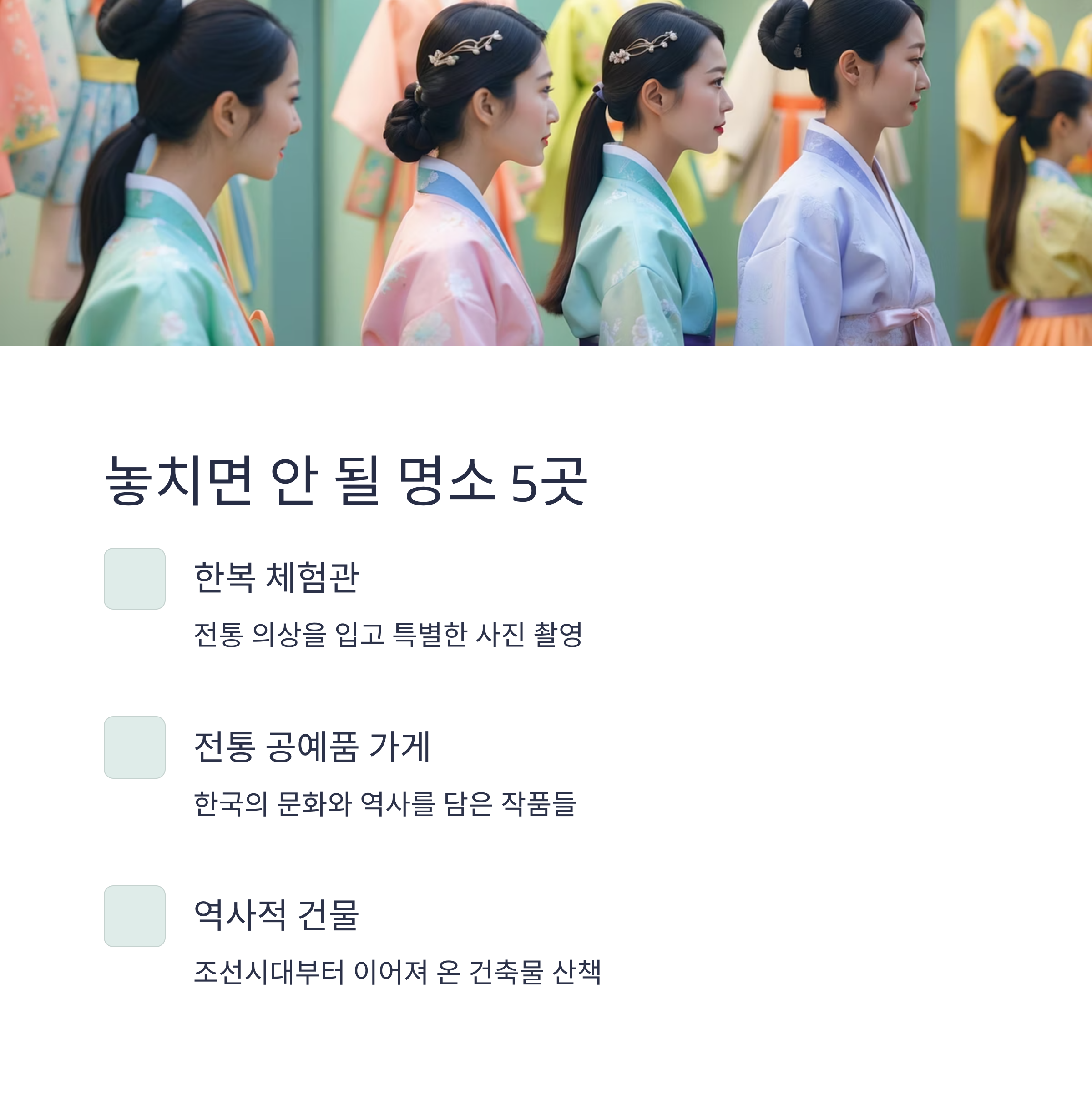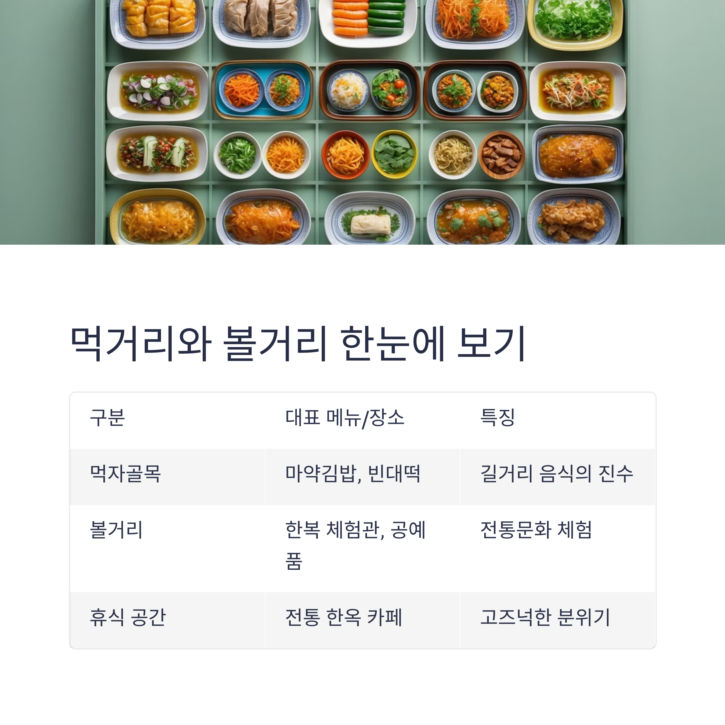| 볼거리 | 한복 체험관, 전통 공예품 가게 | 전통문화 체험 및 기념품 쇼핑 최적지 |