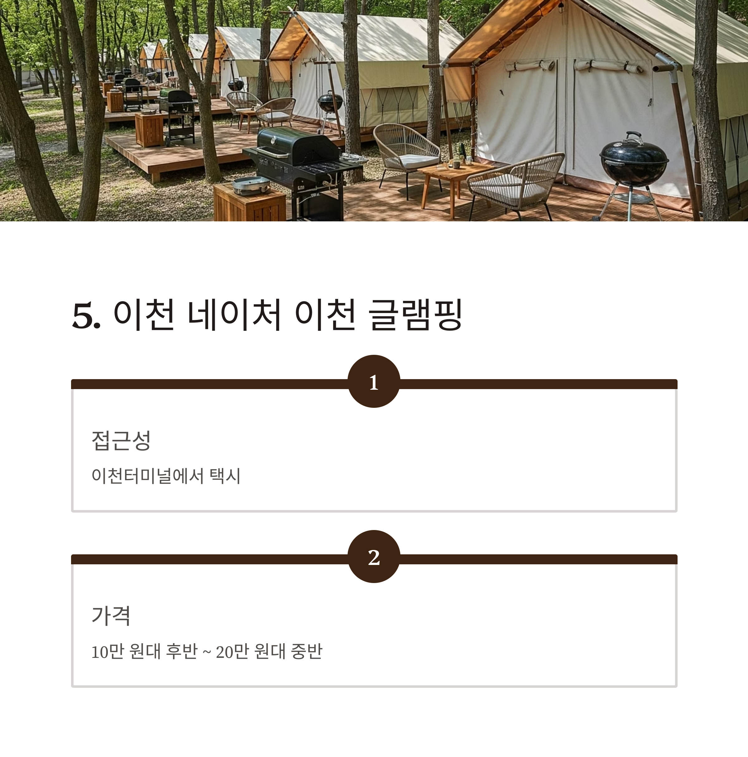 | 네이처 이천 | 이천 | 이천터미널 + 택시 | 10만 원대 후반 ~ 20만 원대 중반 | 도심 가까운 자연, 편리한 시설 |