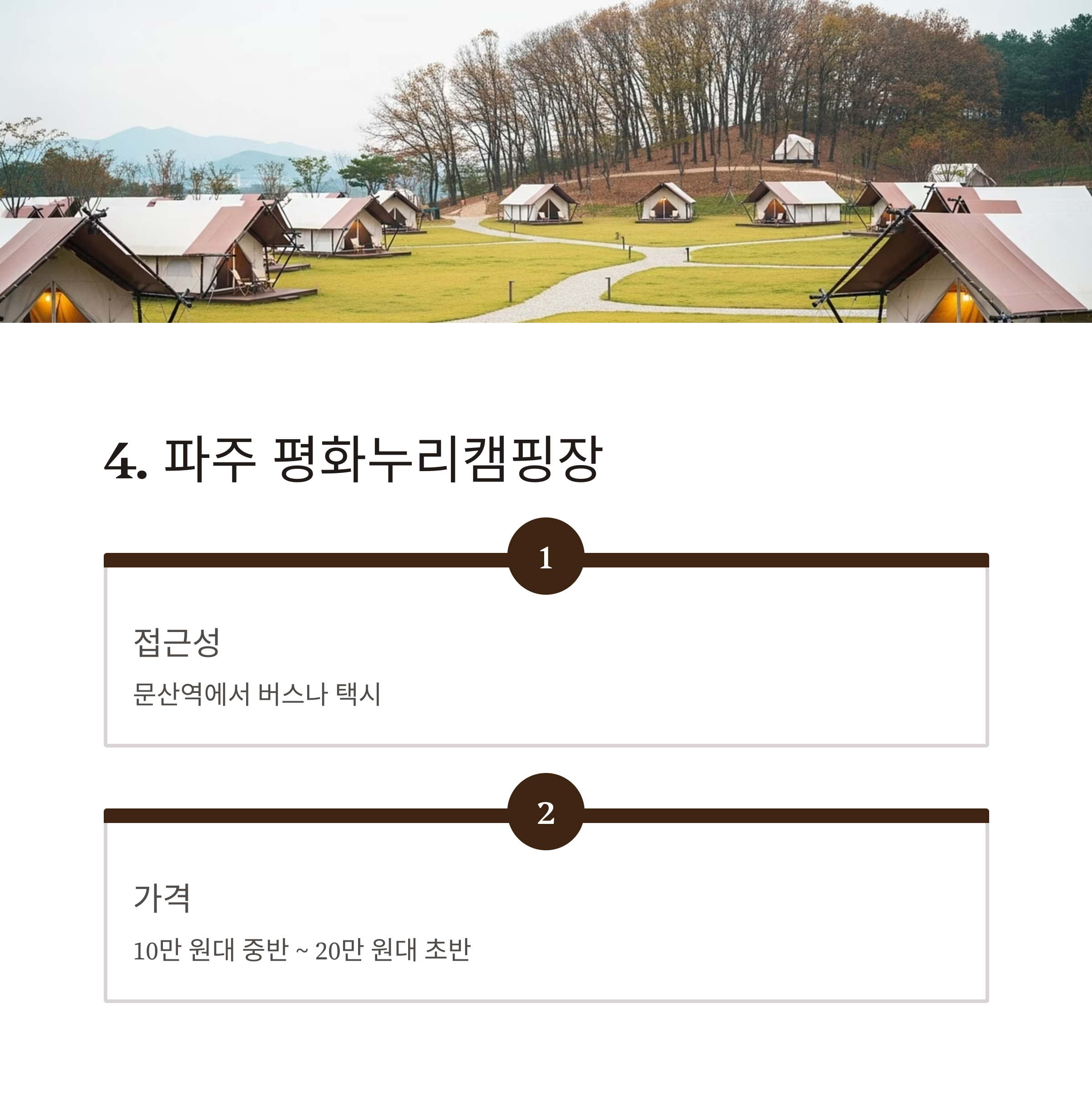| 평화누리캠핑장 | 파주 | 문산역 + 버스/택시 | 10만 원대 중반 ~ 20만 원대 초반 | 넓은 잔디밭, 평화로운 분위기 |