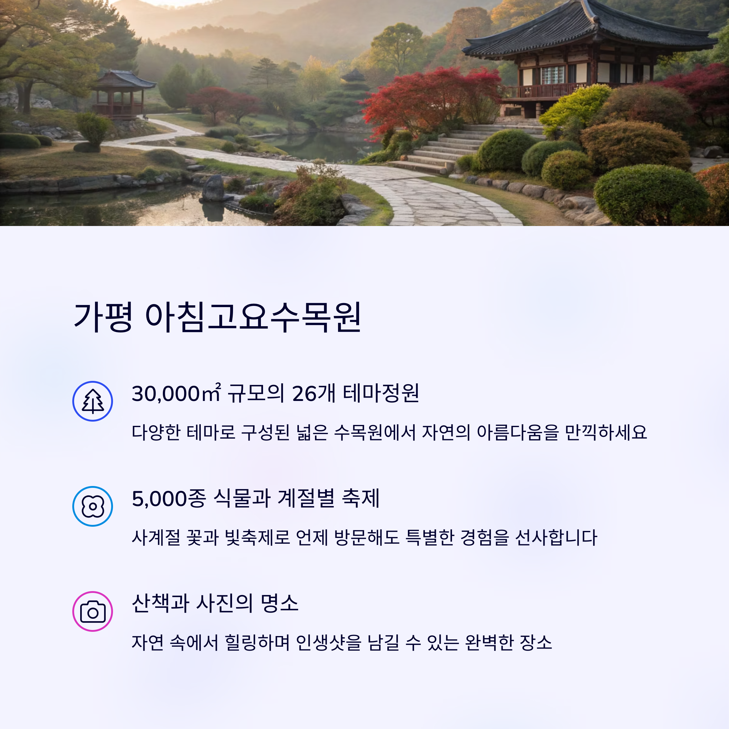 남이섬과 아침 고요수목원은 자연을 즐기기 최적화된 명소로, 가족, 친구, 연인 모두가 편안하게 방문 가능합니다.