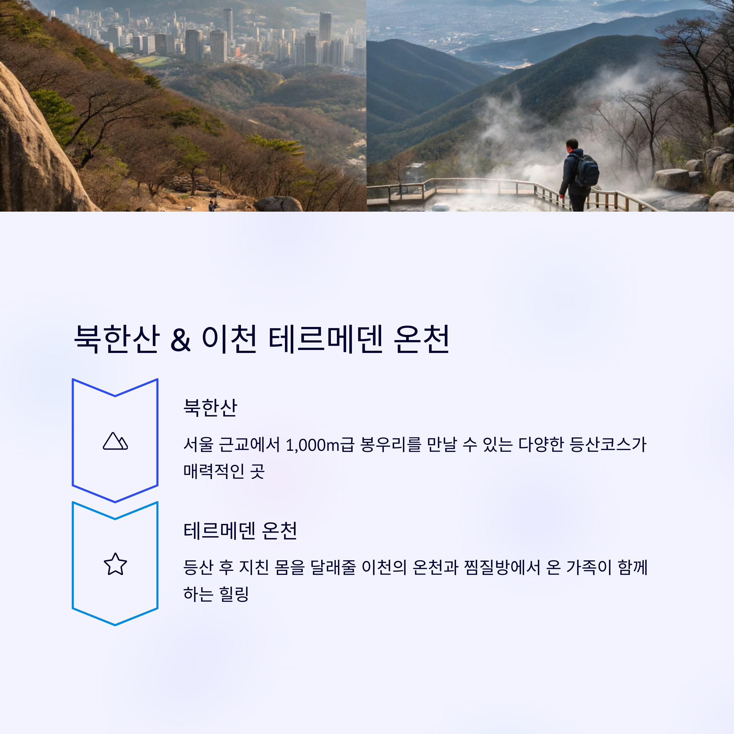 북한산과 같은 서울 근처 명산들은 등산을 즐기는 분들에게도 완벽한 옵션이라고 생각됩니다.