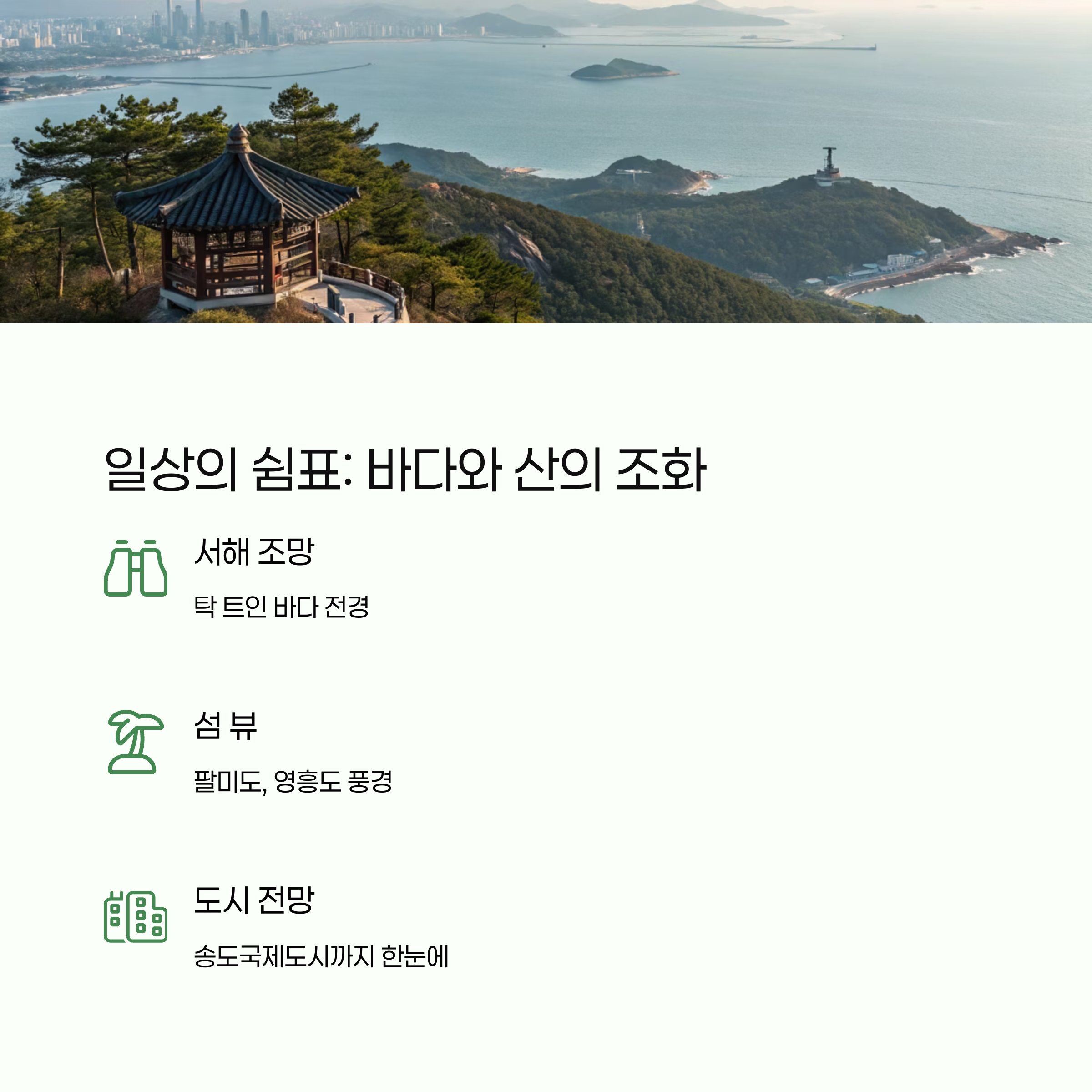 아트살롱카페, 코리달리스 카페, 북악산 둘레길, 소무의도 등은 힐링과 자연 속 여유를 제공하는 최적의 장소입니다.
