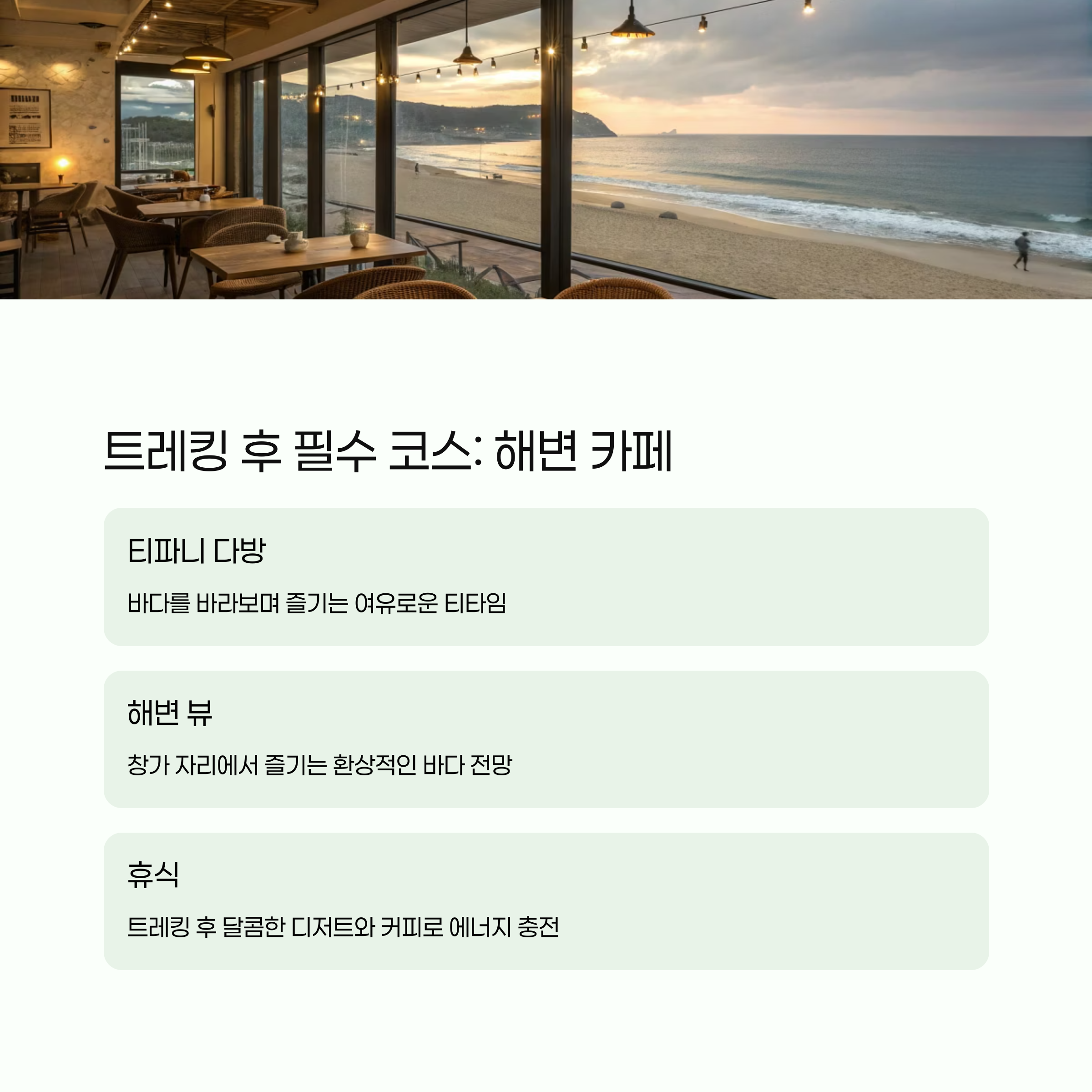 두 카페 모두 여유로운 브런치 메뉴를 제공하며 트레킹 코스와의 거리가 가까워 연계 일정으로 활용하기 편리합니다.