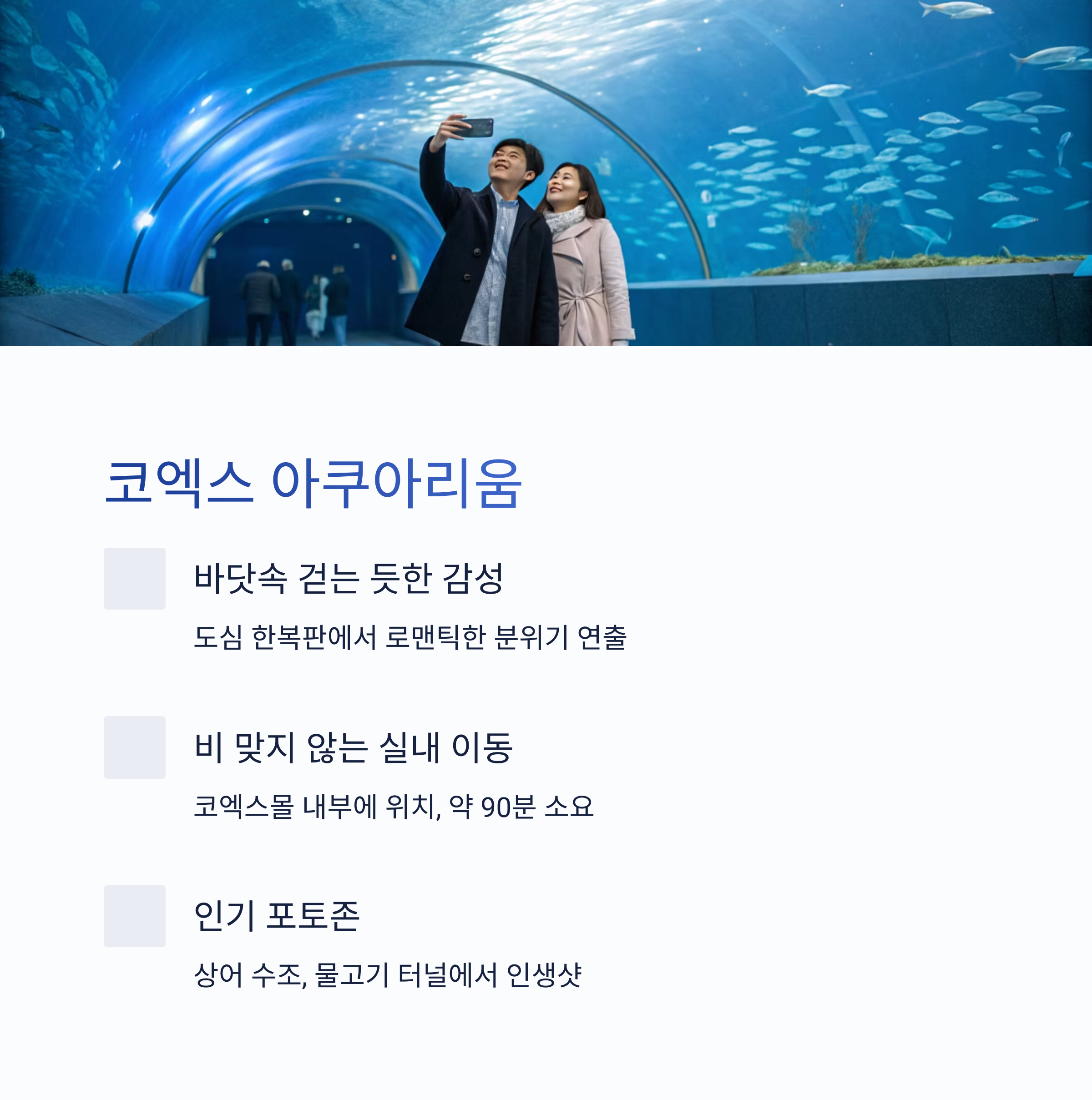| 코엑스 아쿠아리움 | 로맨틱 수중 분위기 | 감성 중심 |