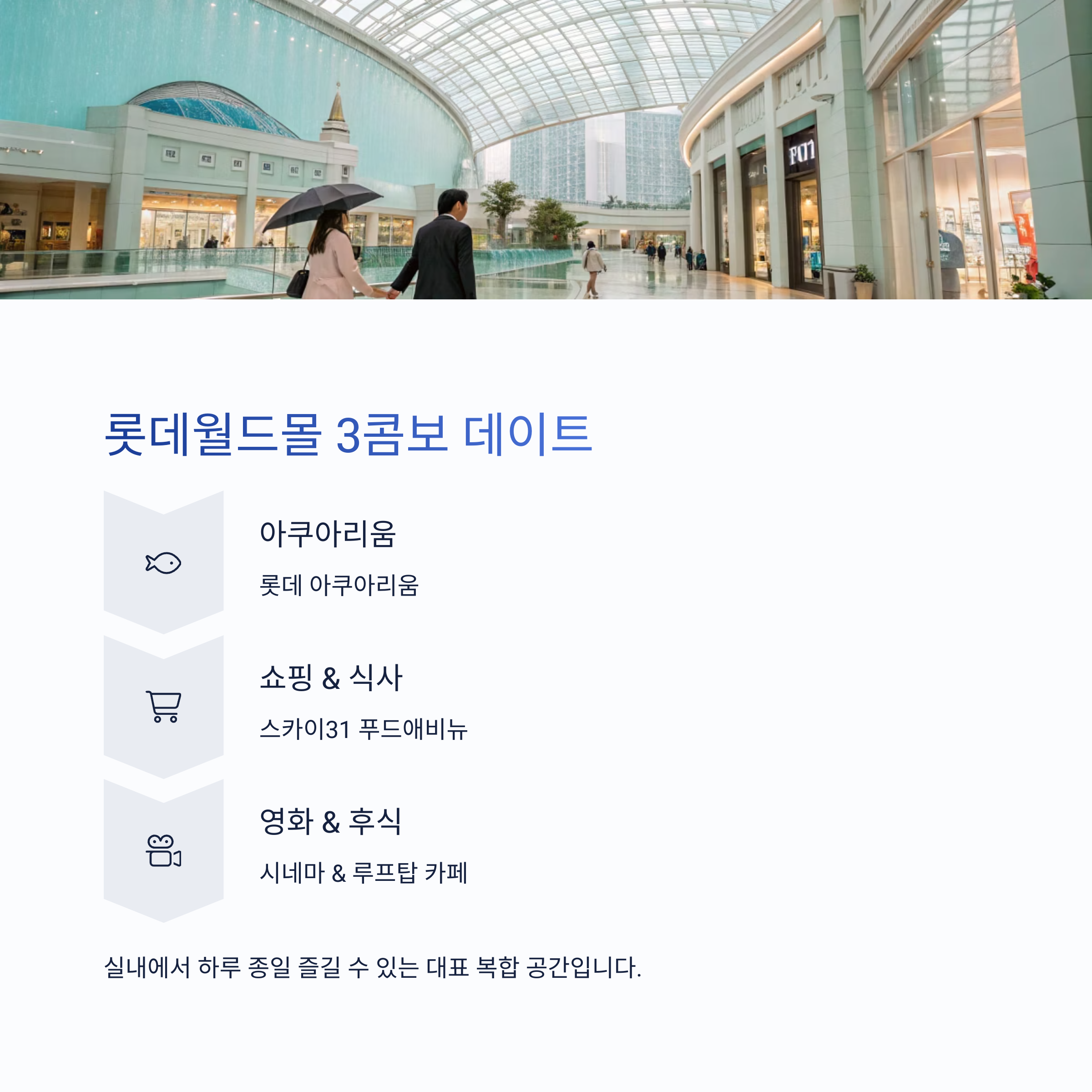 | 롯데월드몰 | 하루 종일 코스 가능 | 종합형 데이트 |