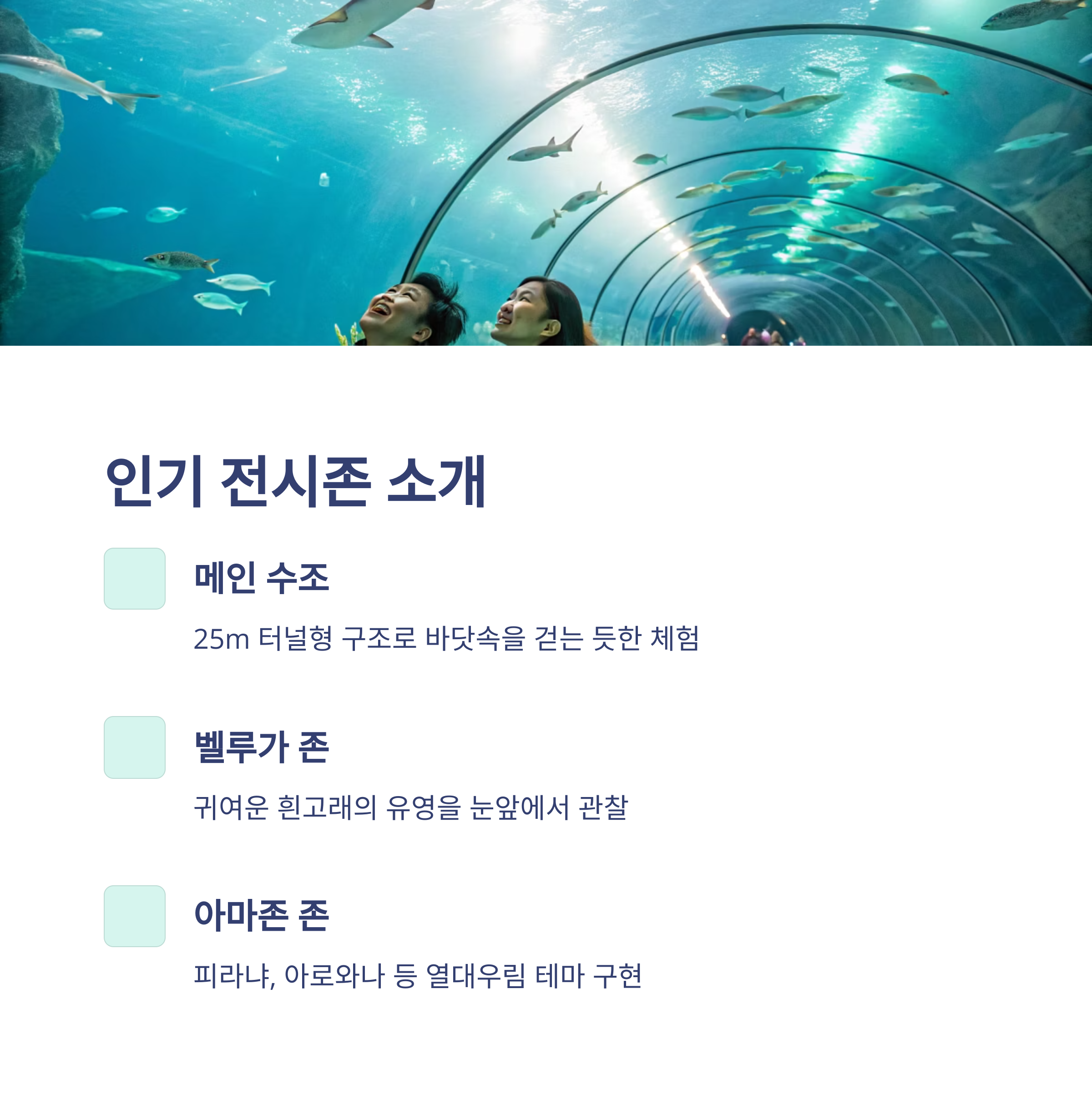 | 메인 수조 | 상어, 가오리 | 25m 터널형 수조 |