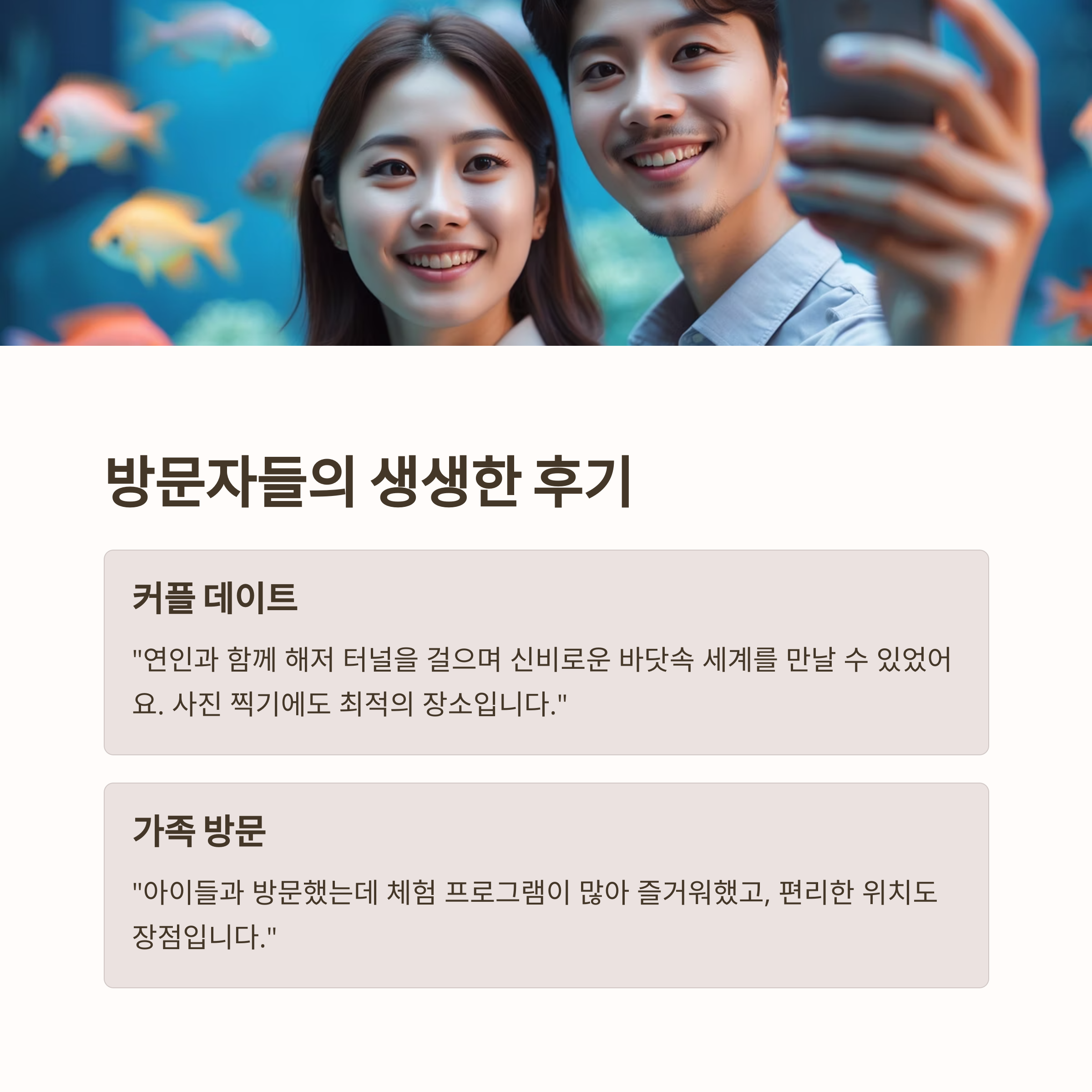 "연인과 함께 해저 터널을 걸으며 신비로운 바닷속 세계를 만날 수 있었어요.