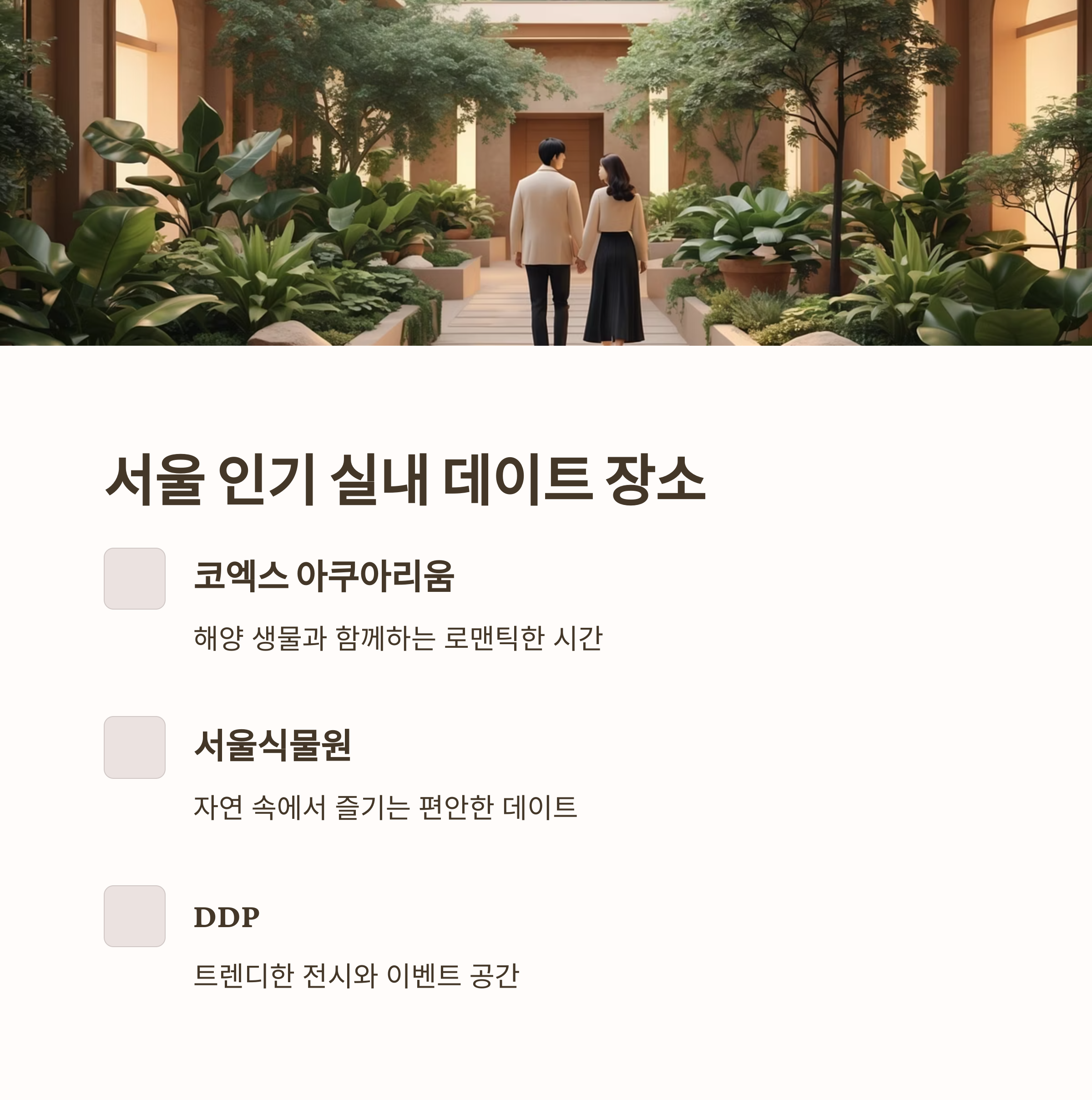 | 실내 데이트 장소 | 코엑스 아쿠아리움, 서울식물원, DDP | 다양한 체험과 문화 공간 제공 |