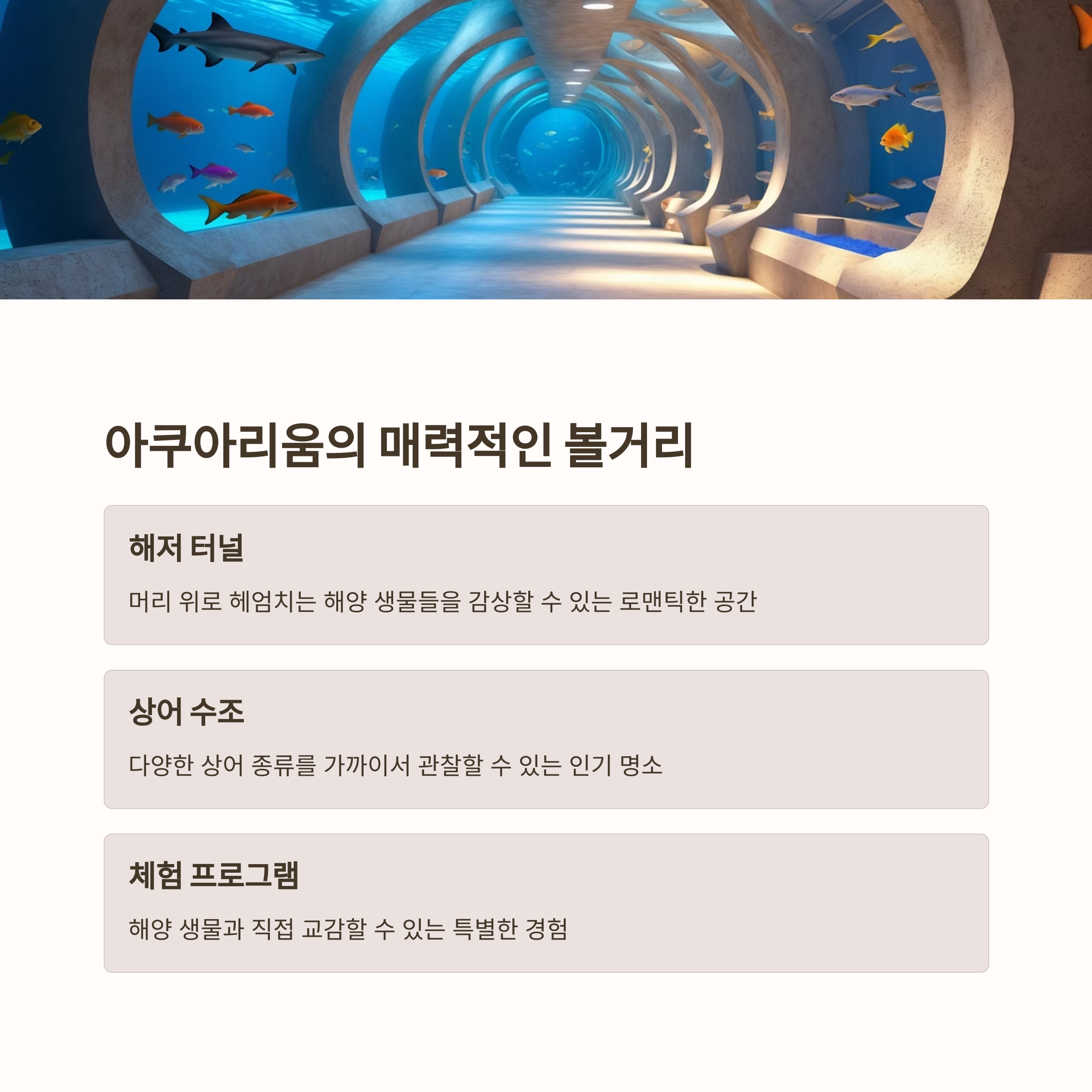 | 아쿠아리움 볼거리 | 해저 터널, 상어 수조, 체험 프로그램 | 신비로운 해양 생물과 가까운 거리 체험 가능 |