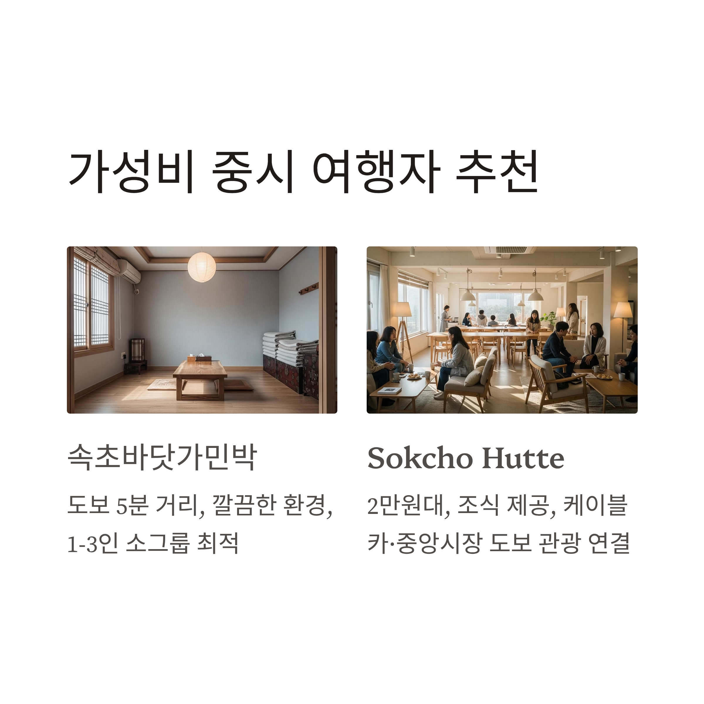 | Sokcho Hutte | 게스트하우스 | 1.8만원~3만원 | 도보 약 15분 | 자유여행자 인기, 조식 제공, 소셜 분위기 |
