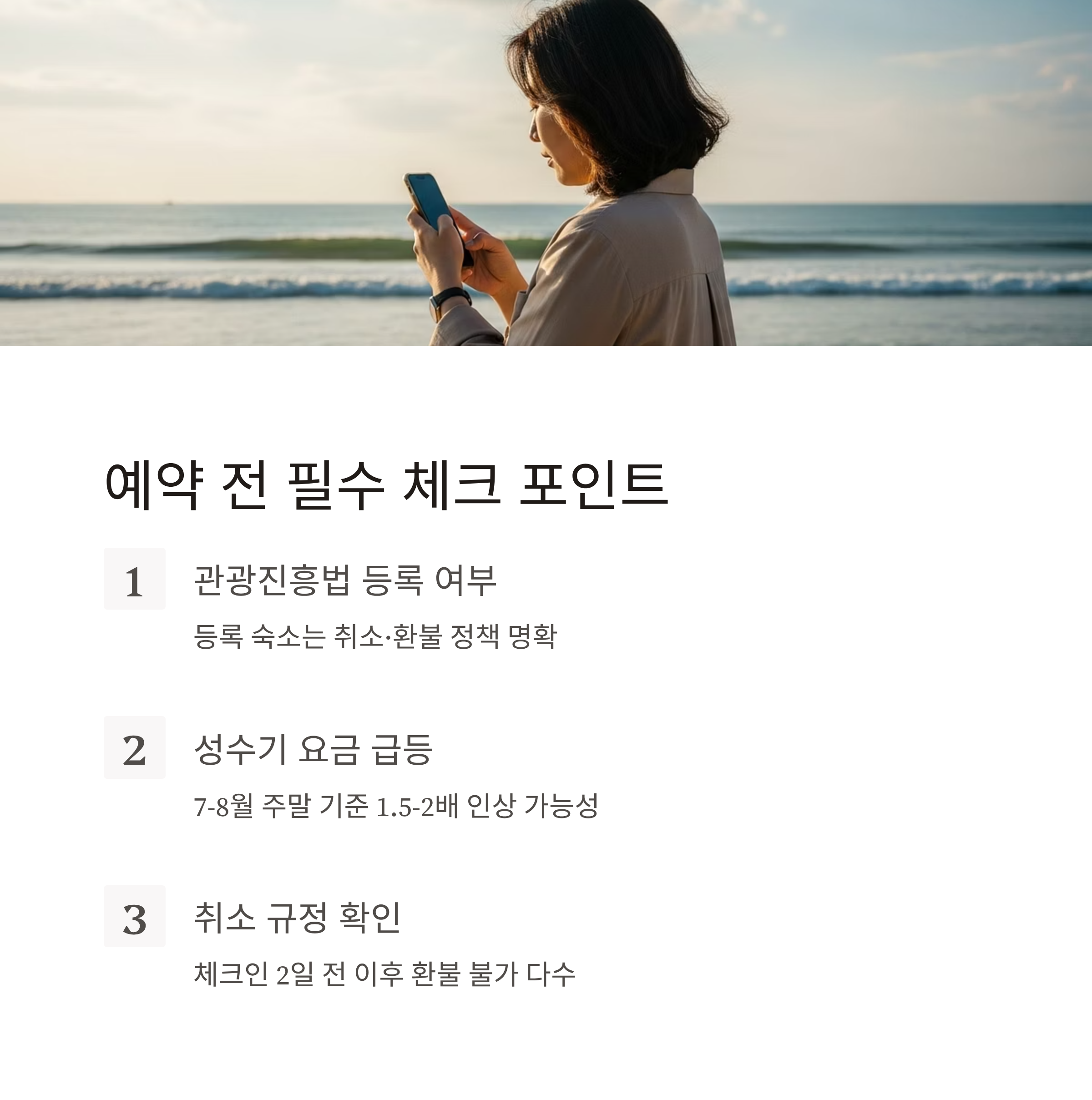 → 체크인 2일 전 이후 취소 시 환불 불가 숙소 다수 존재 - 해수욕장 이용 준비물