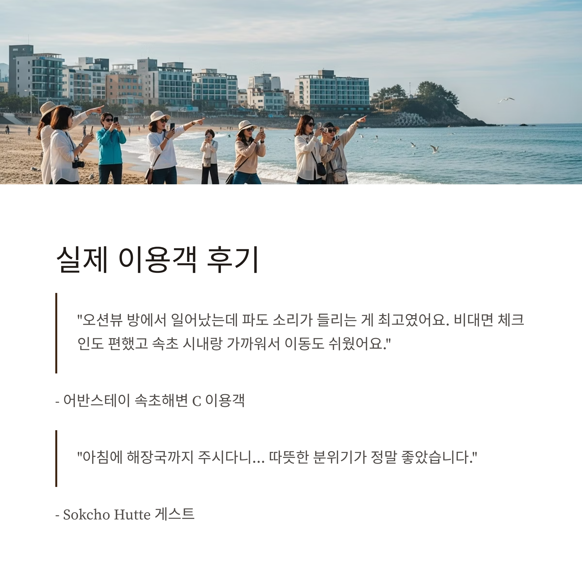| 어반스테이 속초해변 C | 레지던스형 | 8만원~15만원 | 도보 1분 | 넷플릭스 가능, 오션뷰, 비대면 체크인, 청결도 우수 |