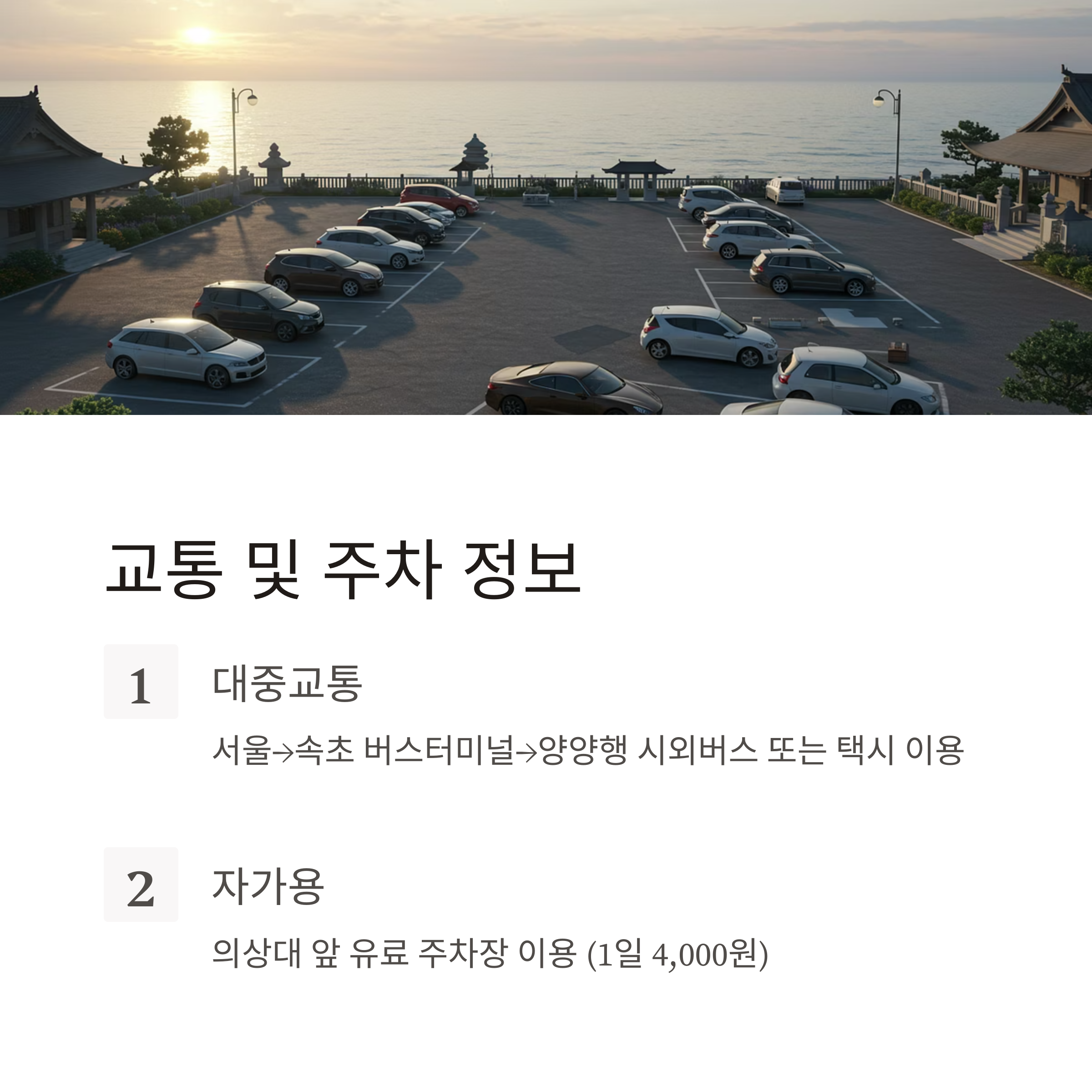 | 속초 → 낙산사 | 속초터미널 출발, 양양행 시외버스 또는 택시 (약 40~50분 소요) |
