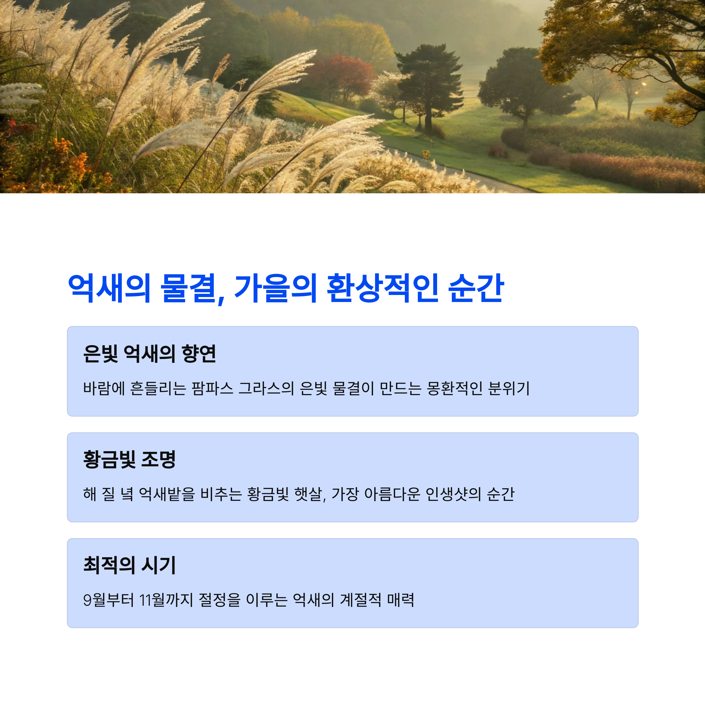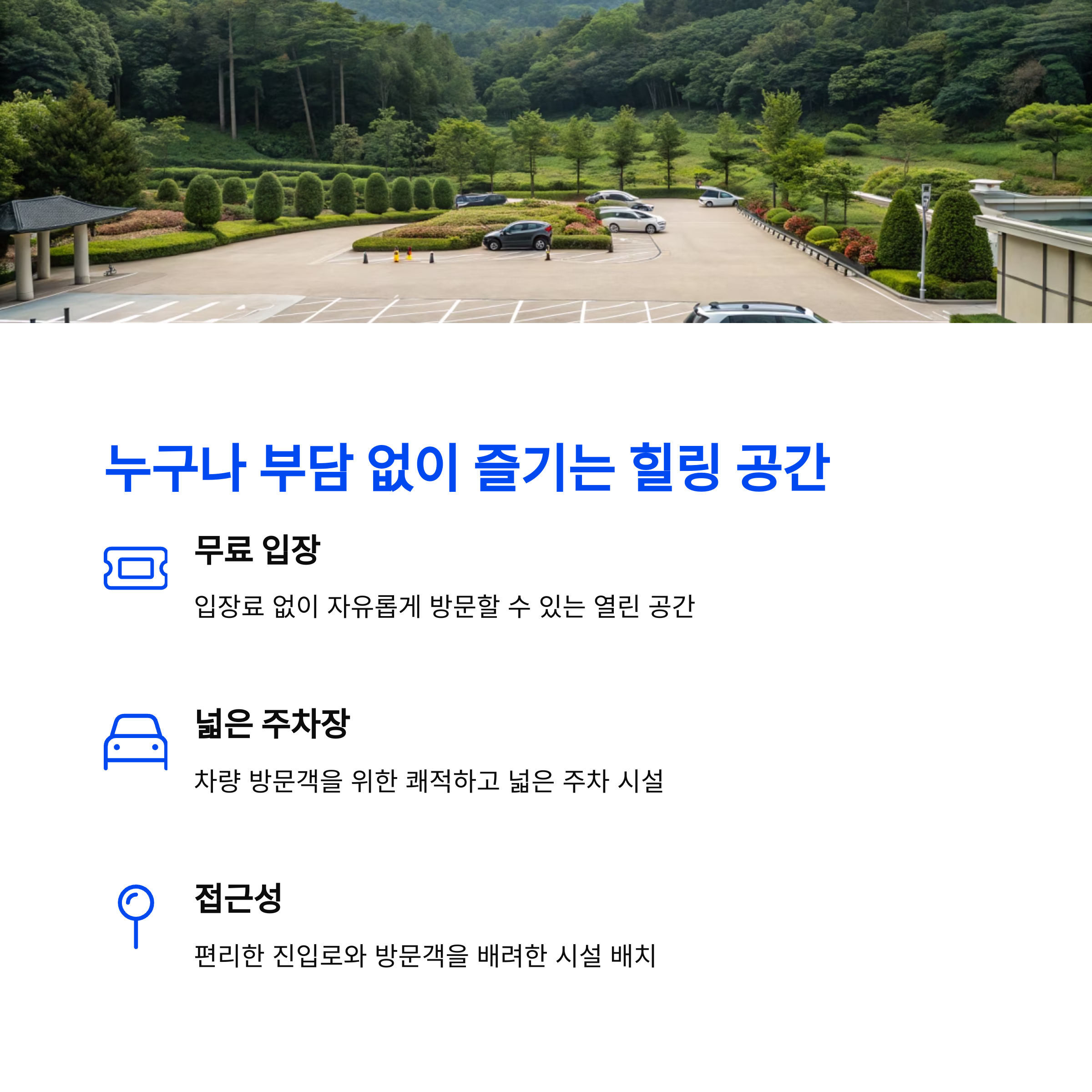 | 봄철(4~5월), 가을철 | 팜파스 그라스, 원형 벤치 등 | 무료 주차장, 탐방센터 |