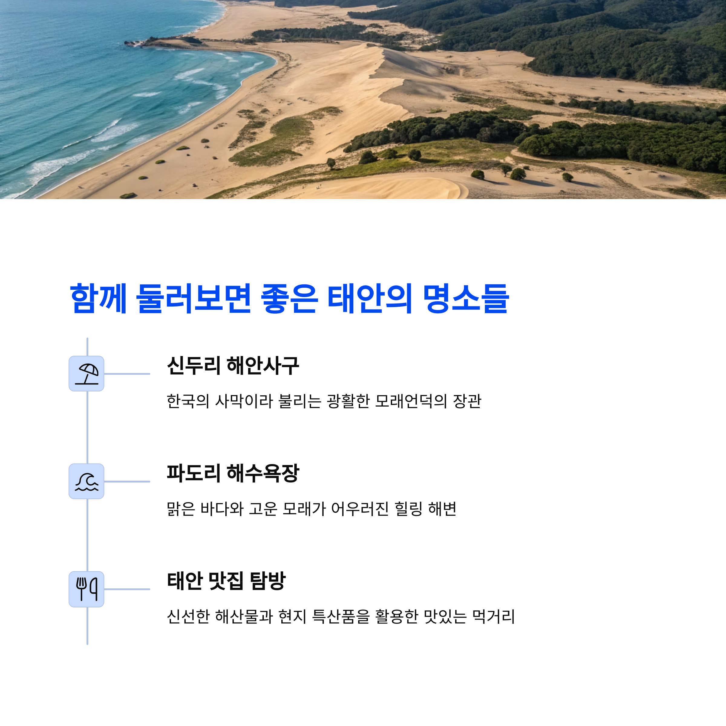 탐방 후에는 지역 맛집이나 갓 잡은 해산물을 맛볼 수 있는 태안 전통시장을 추천합니다.