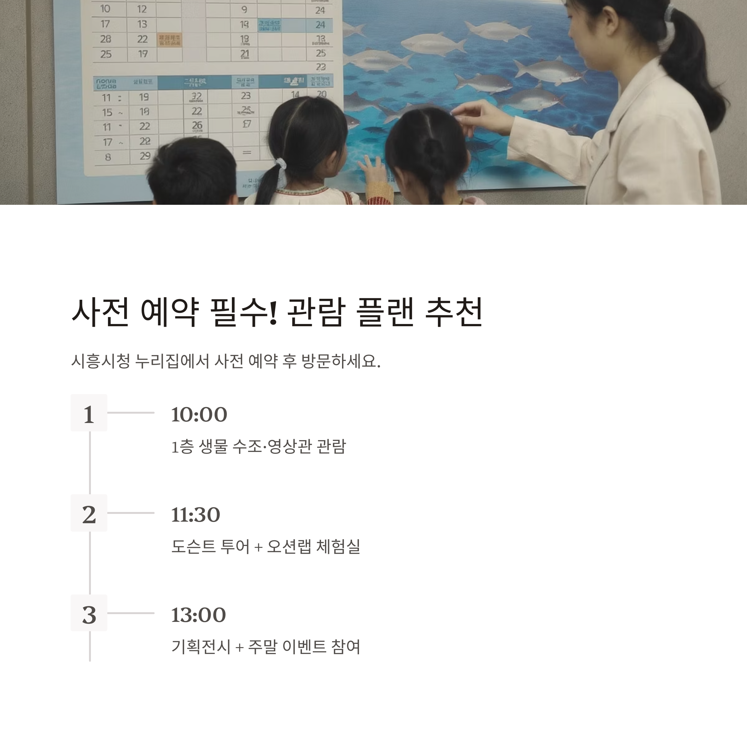 - 10:00 도착 → 1층 생물 수조·영상관 관람