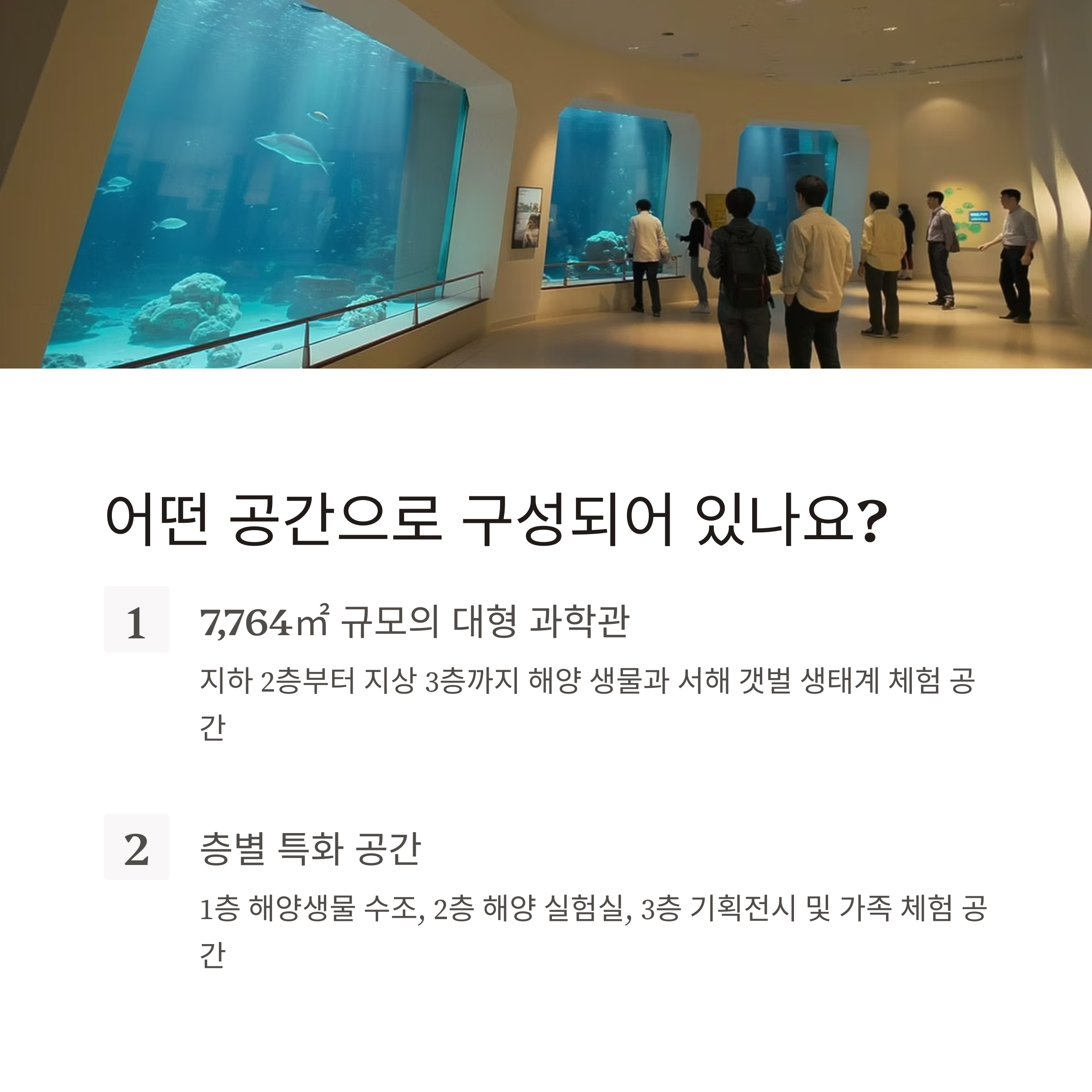 | 1층 | 서해안 해양생물 보호 수조, 갯벌 생태 영상 전시 |
