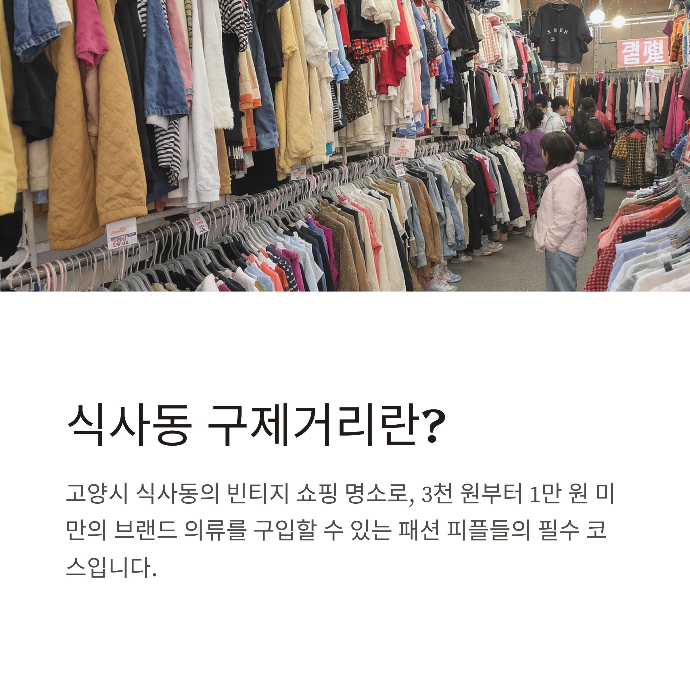 고양시 식사동에 위치한 ‘구제거리’는 전국에서도 손꼽히는 빈티지 쇼핑 명소입니다.