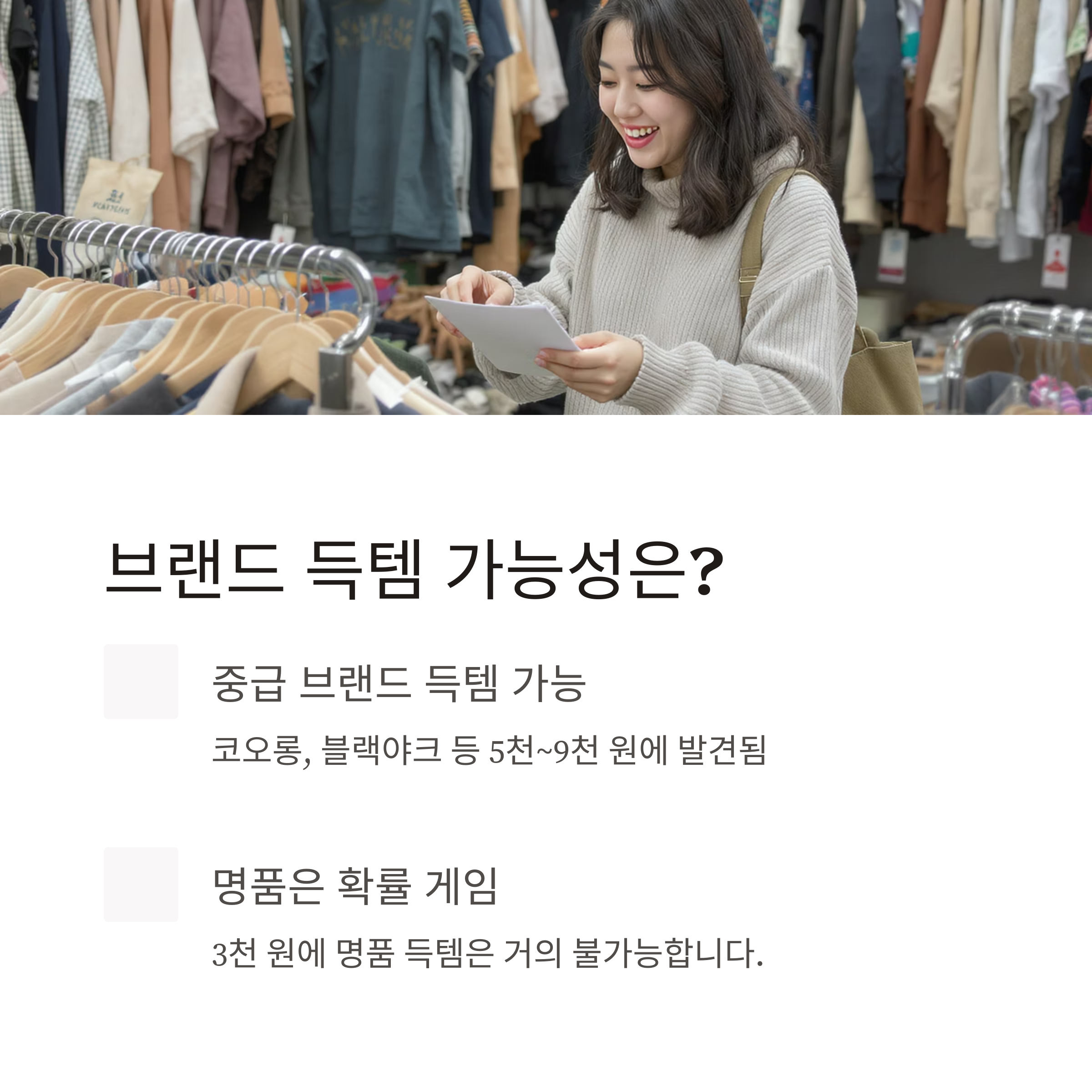 결론부터 말하자면, 브랜드 의류 득템은 가능하지만 명품은 확률 게임입니다.